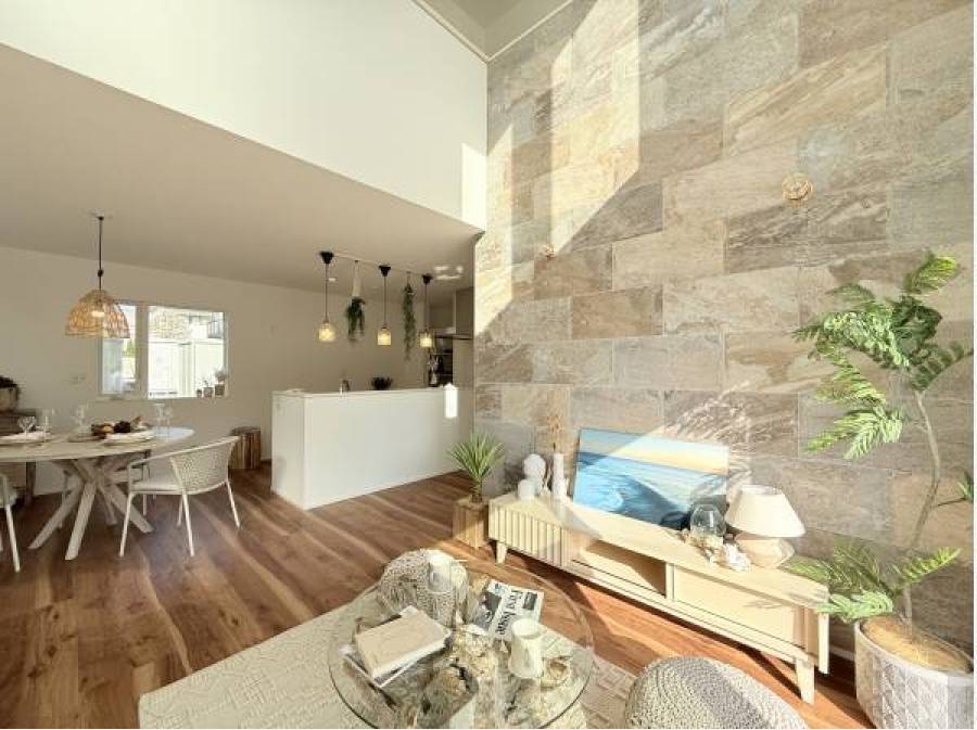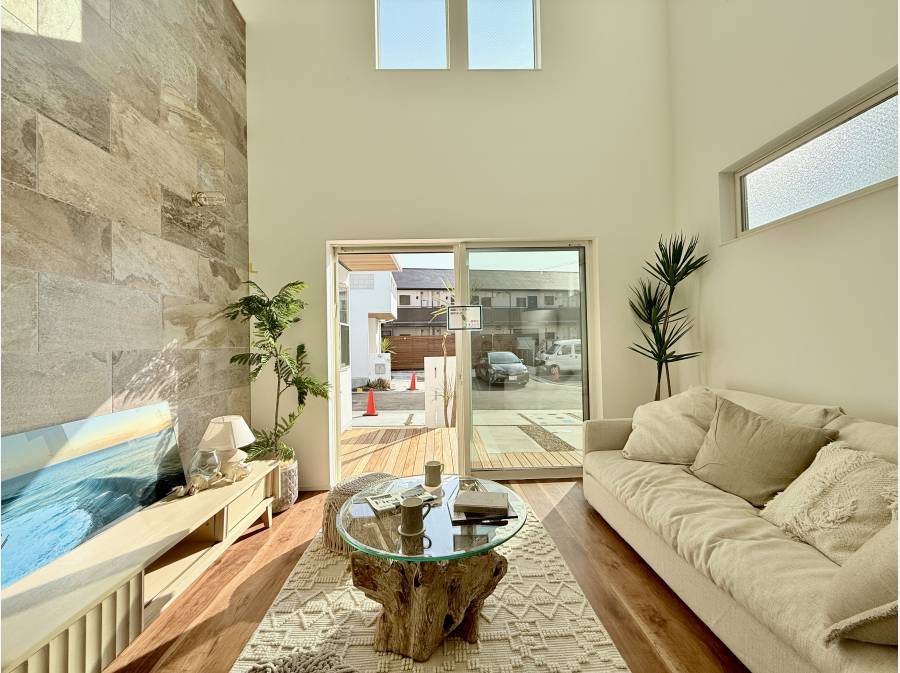 約21帖の広々としたLDKは、天井高3mの開放感が特徴で、「花ブロック」がリゾート感を引き立てています。