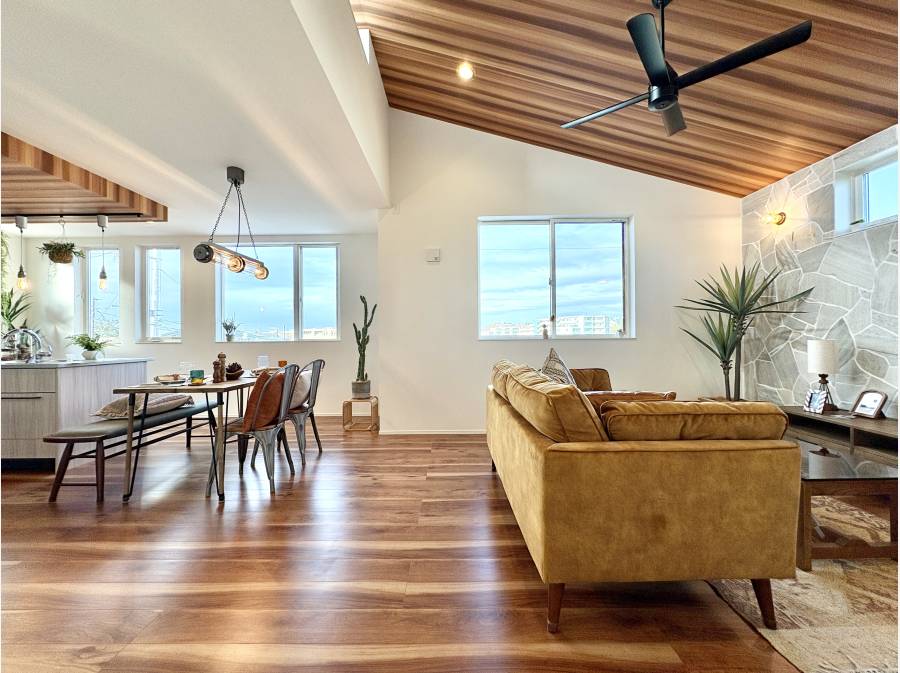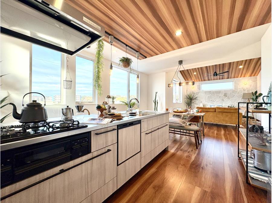 室内は天井高約3mを確保した約20.9帖の開放的なLDKを中心に、女性設計士が考案した「生活が豊かになる間取り」を実現。