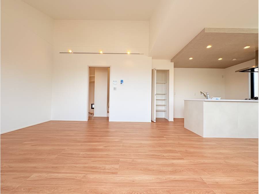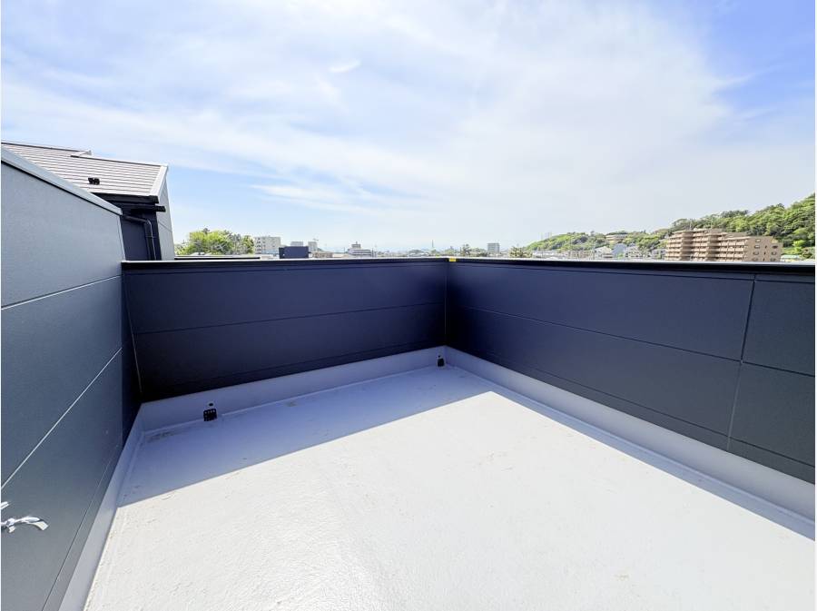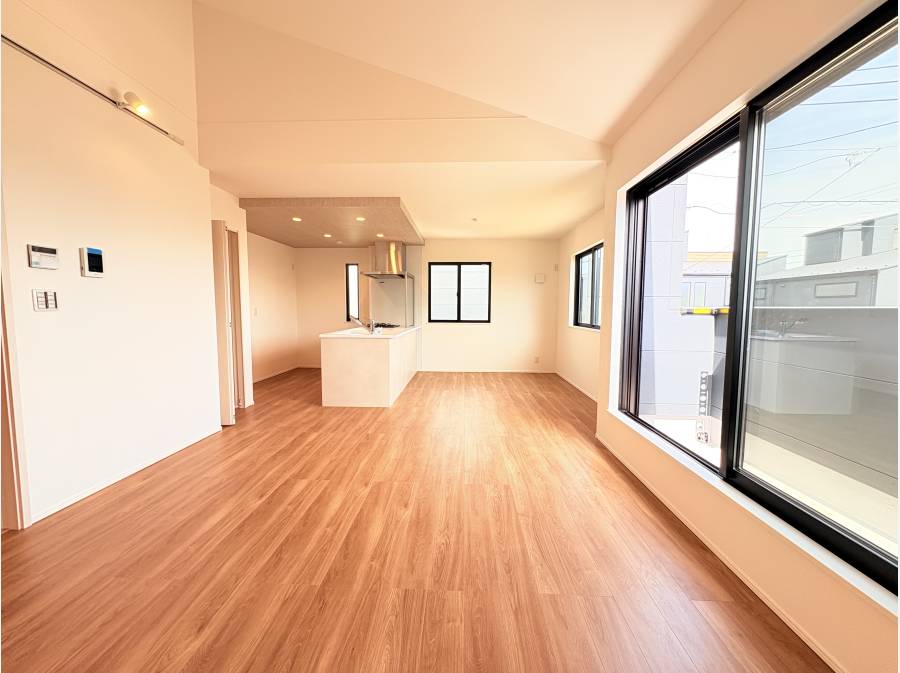 2階の広々とした約18帖のリビングは、陽光がたっぷり差し込み明るく快適な空間です。ルーフバルコニーには水栓が付いており、ご家族でBBQを楽しむことも可能です。