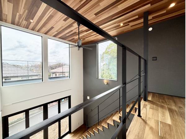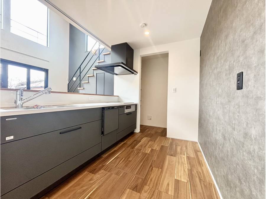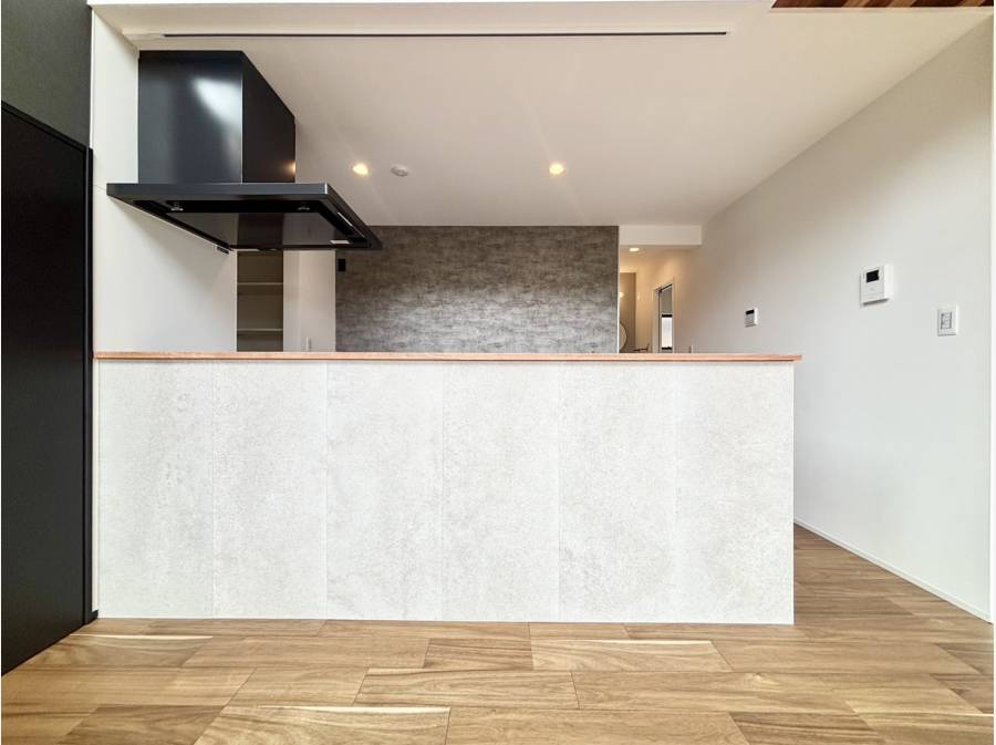 間取りは、ゆとりある空間設計が特徴です。リビングには、視覚的なアクセントとなる下がり天井を採用した対面キッチンを備え、料理中も家族とのコミュニケーションが途切れません。
