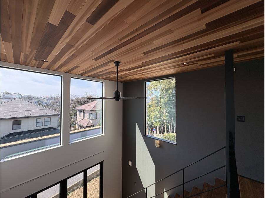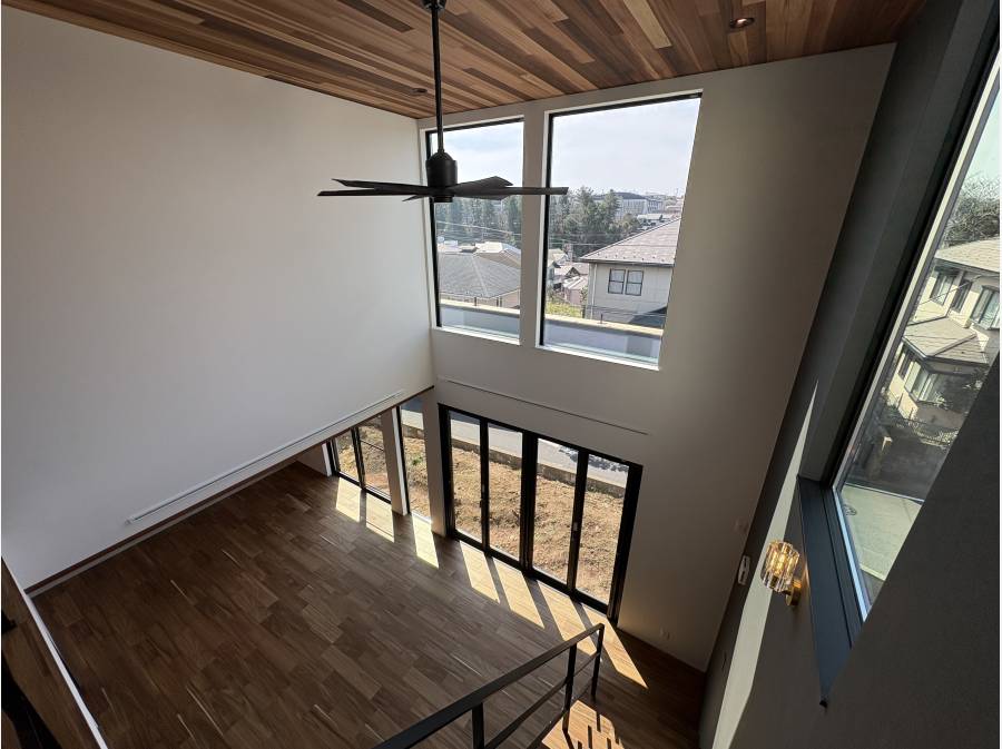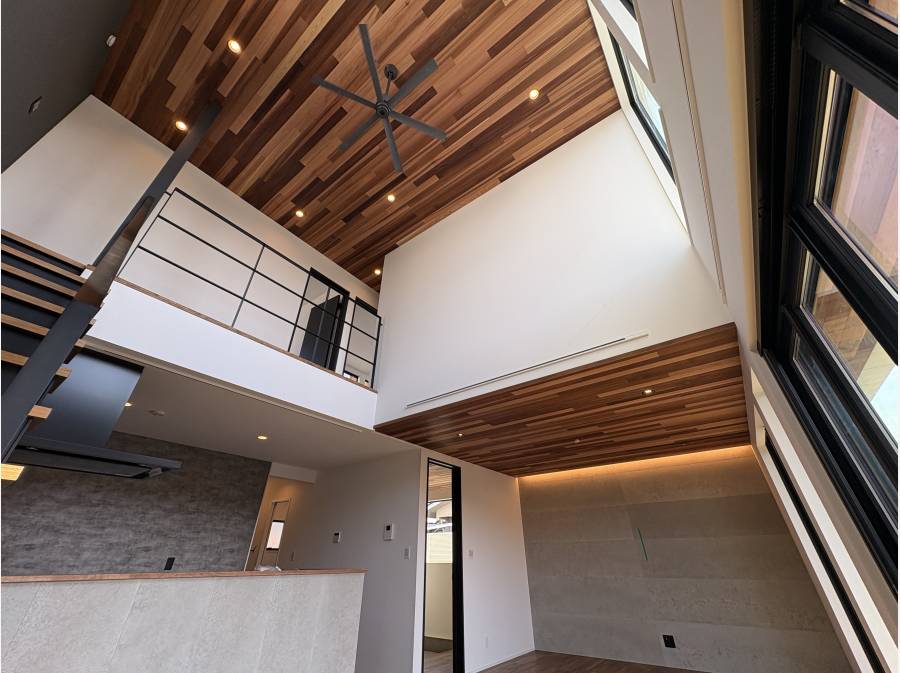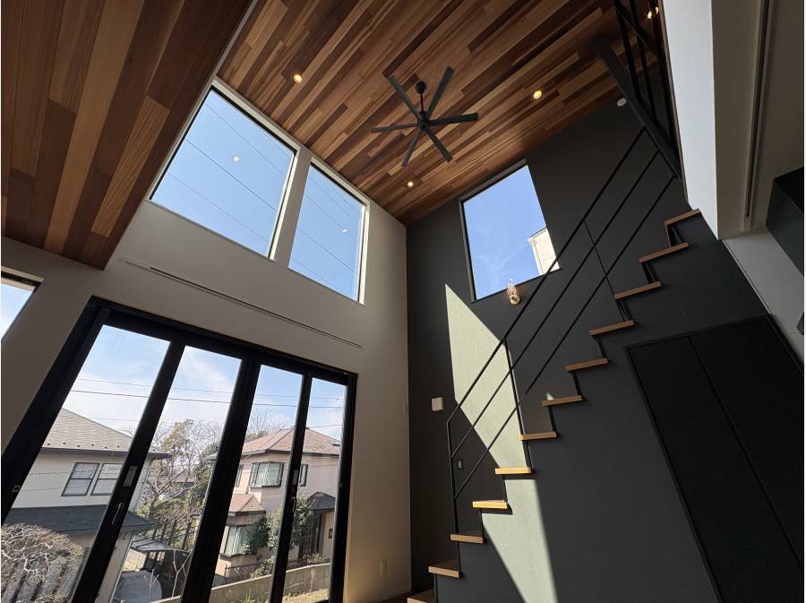 外観はスタイリッシュであり、家の中は窓が大きく吹き抜けも有り、開放的な設計となっております。
