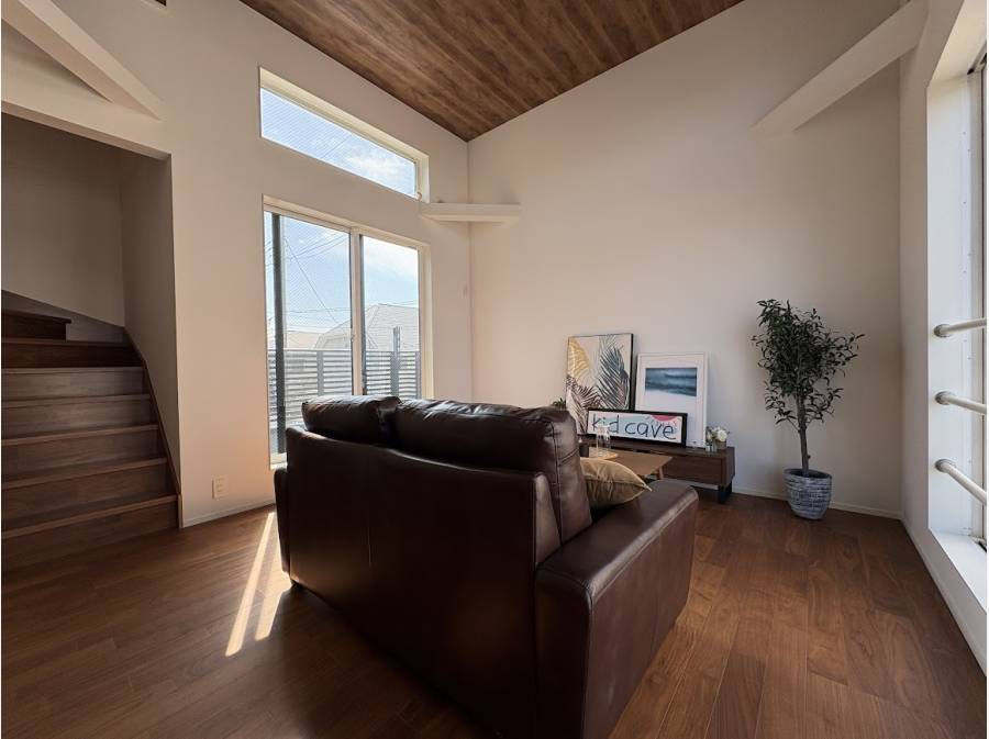 開放感のある吹き抜けのリビングや、プライベートな時間を楽しめる書斎など、デザイン性と機能性を兼ね備えた住まいです。