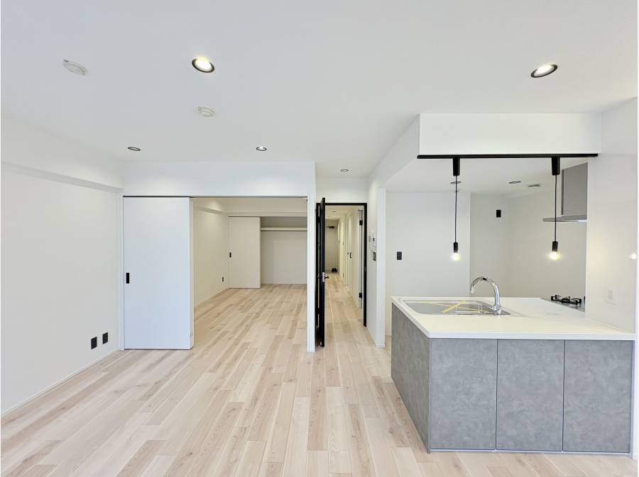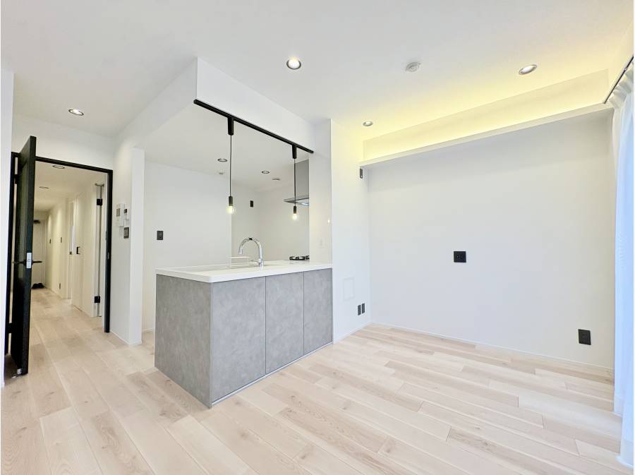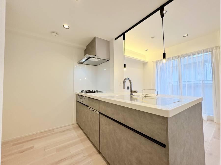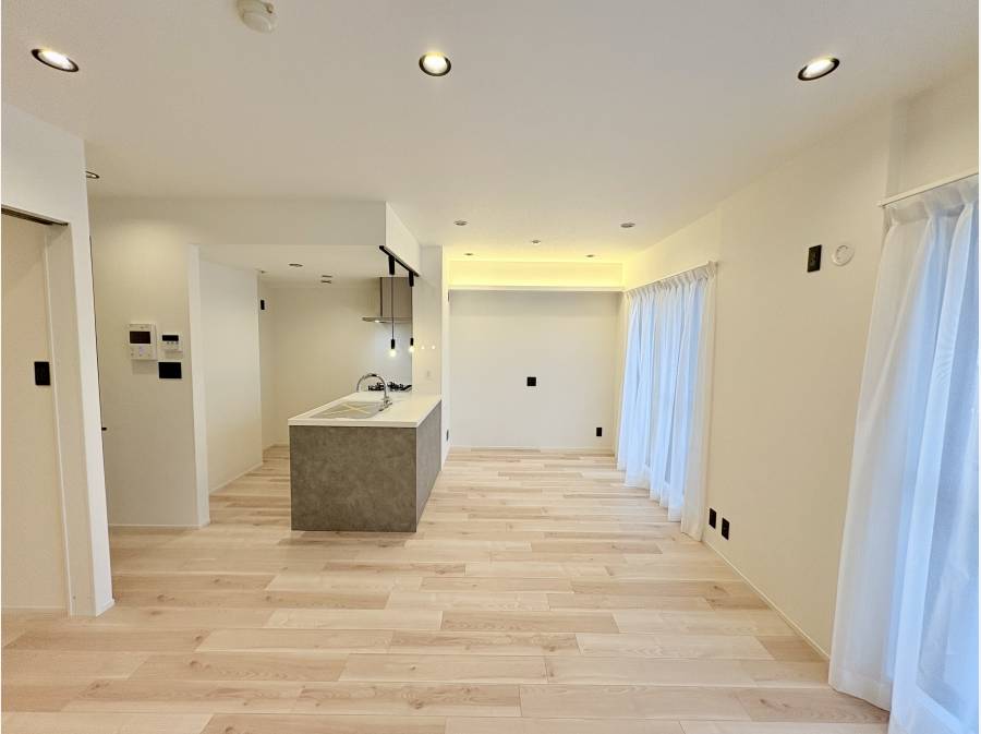 約15帖のリビングダイニングキッチンは、明るく広々としており、ご家族でゆったりと過ごせる空間です。対面式のシステムキッチンやお洒落な照明など、日々の暮らしを豊かにする内装設備もポイントです。