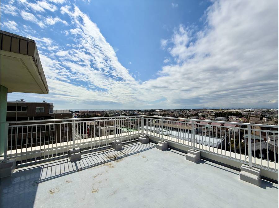 お部屋は最上階の角部屋で、広々としたルーフバルコニーが付いています。室内からは富士山と相模湾を一望できる素晴らしい眺望が楽しめます。