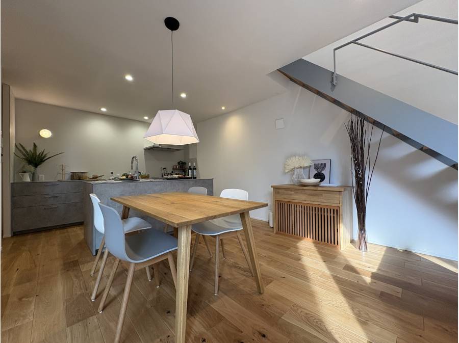 街並みの中で異彩を放つスタイリッシュな外観、そしてLDKには「グラフテクト社」のオープンキッチンを採用。スケルトン階段を上がった先には、ライフスタイルに合わせて活用できるフリースペースが広がります。