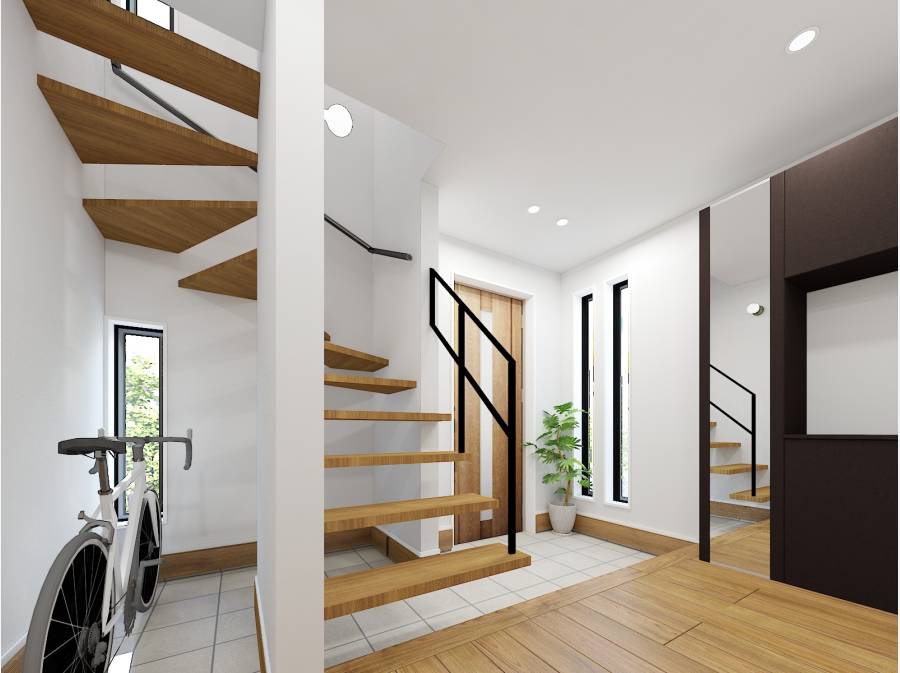 玄関を開ければサーフグッズやロードバイクも置ける広々とした空間。
