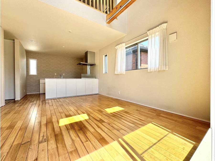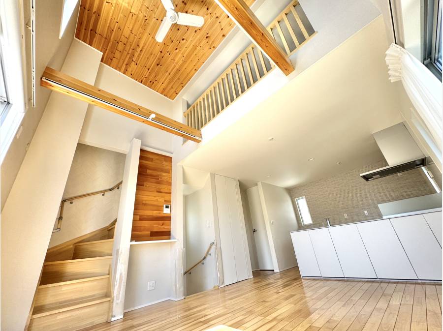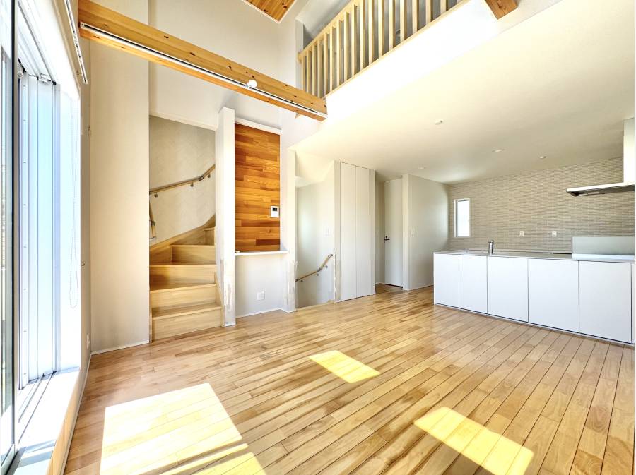 南道路に面した明るい住まいは、勾配天井と高窓がもたらす開放感が魅力です。リビングには自然光がやわらかく差し込み、日常のひとときを心地よく包み込みます。