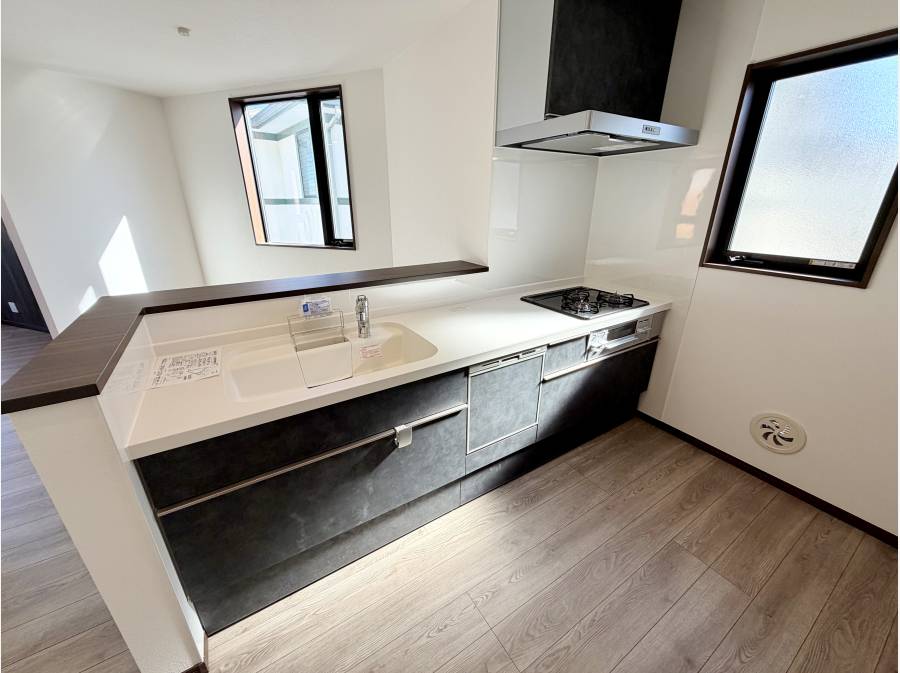 LDKは17.26帖、洋室4.5帖と2階の間取りはご家族でまったりとリラックスできる空間。キッチンはペンシュラ型の対面式システムキッチン調理に集中できる設備充実です。