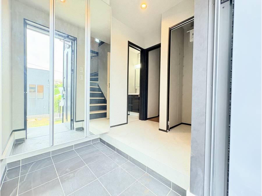 今回ご紹介するE棟は、黒を基調としたモダンな外観が目を引く住まいです。敷地面積は約165㎡(49坪超)、建物面積は105㎡超の4LDK+書斎プランで、ゆとりある暮らしを実現します。