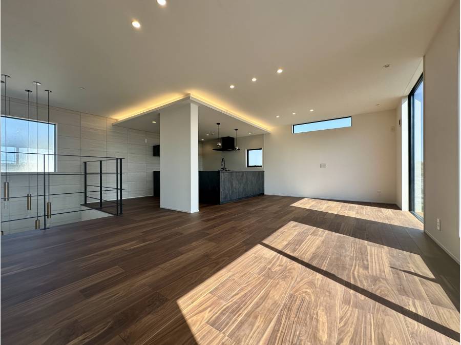 24帖のリビングは、ウォールナットカラーのフローリングとデザイン性の高い階段が印象的で、モダンな重厚感を感じられる仕上がりです。