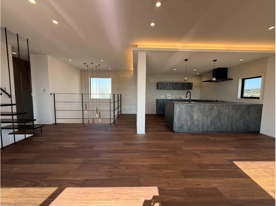 ウォールナットの無垢材が醸し出す温もりと、オブジェのようなデザイン階段。開放感の中に重厚な空気が流れる、上質なLDKを実現しました。