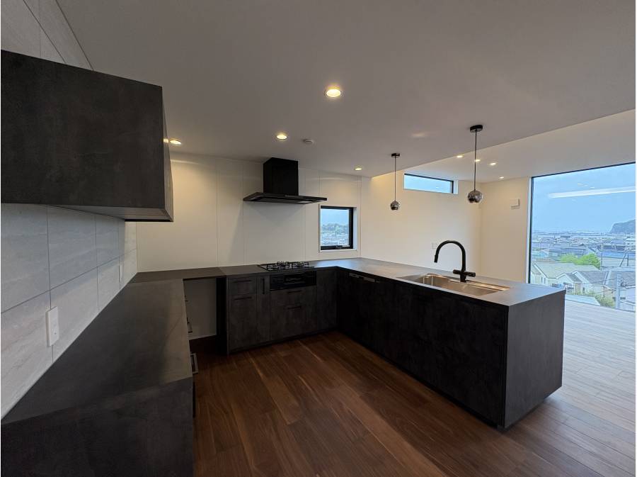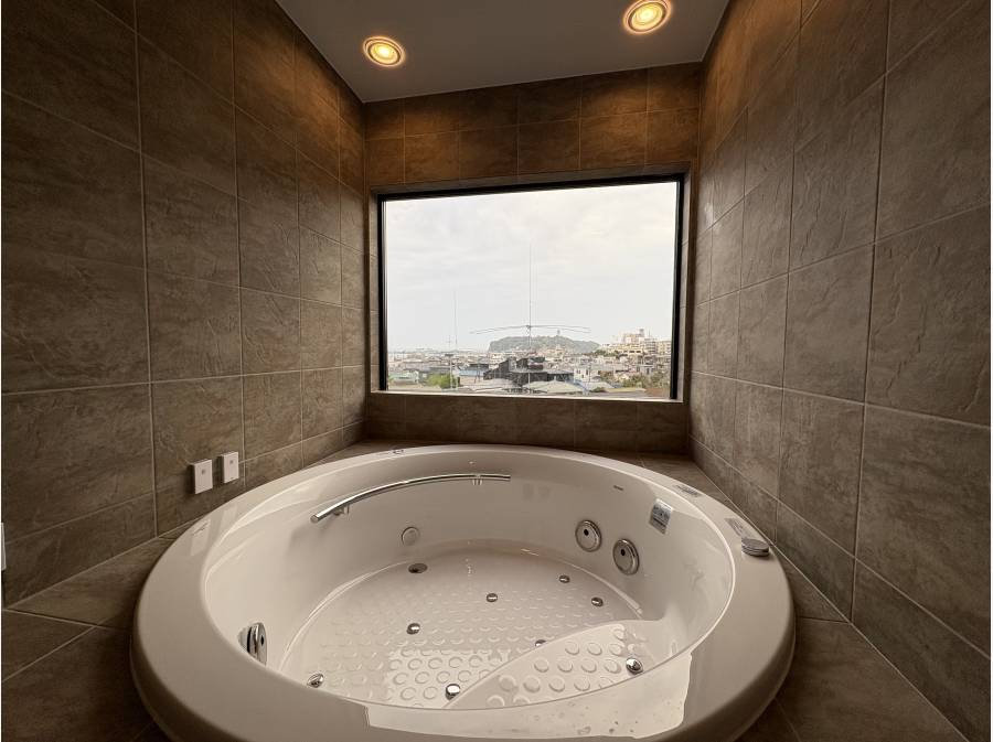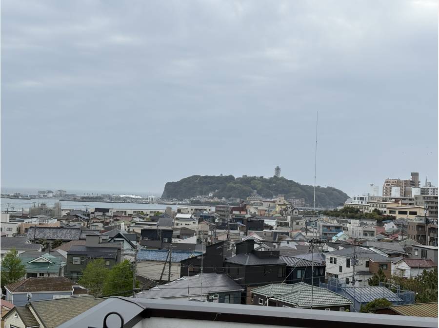 高台の地形を活かし、リビングから江の島と海を楽しめる邸宅です。書斎からも海が見え、約24帖のLDKや1.75坪のジャグジー付きバスルーム、2台分のカースペースを備えています。