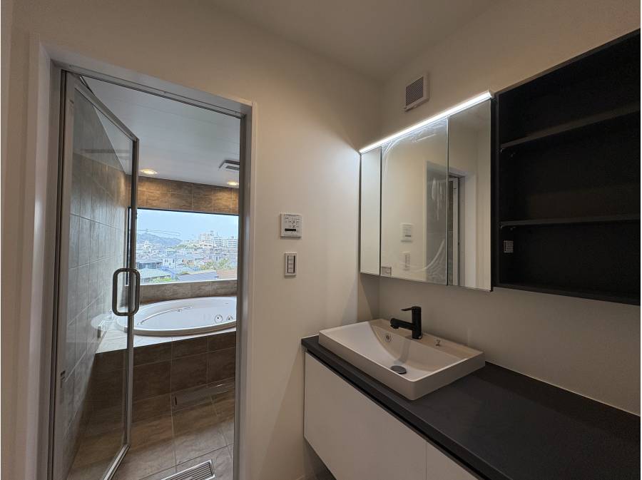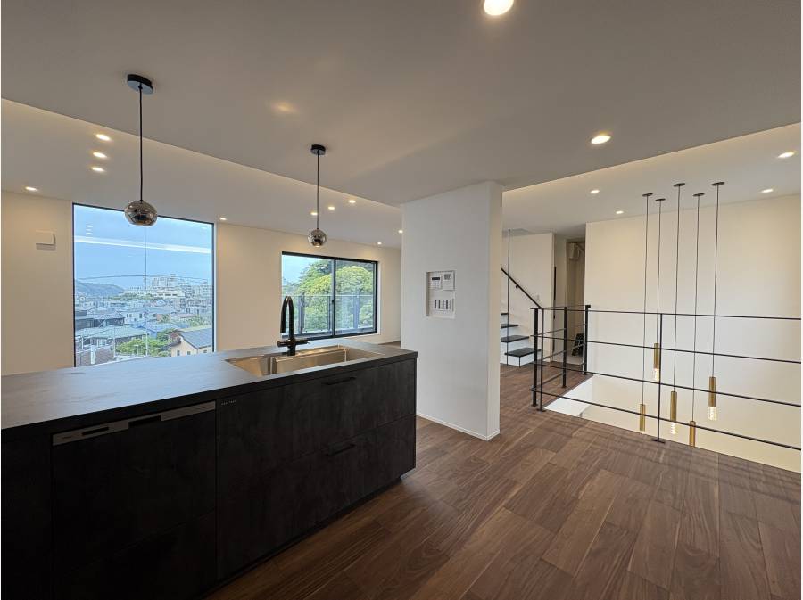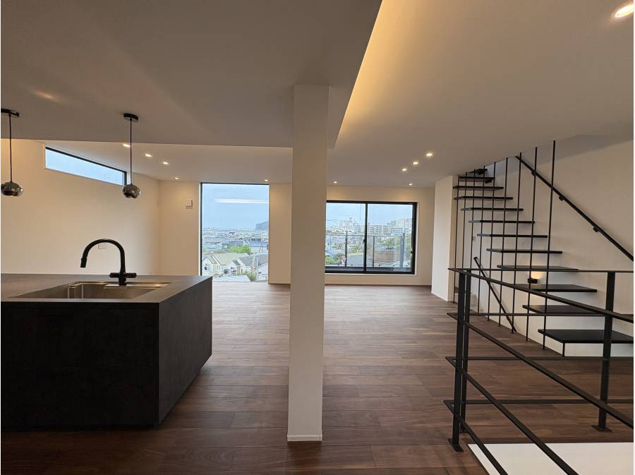 敷地面積約67坪、建物は約36坪の広さ。約24帖の広々としたお洒落なLDKや、1.75坪のジャグジーバスルームを備えています。リビングや書斎からは海を望む景色が広がり、大きな窓ガラス越しの眺めがとても印象的です。