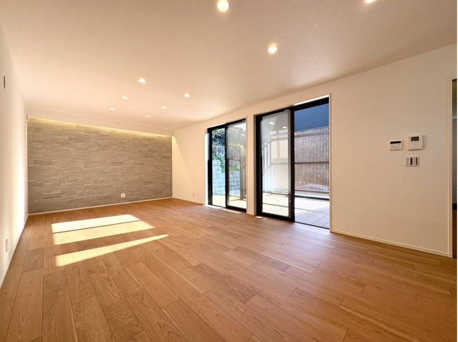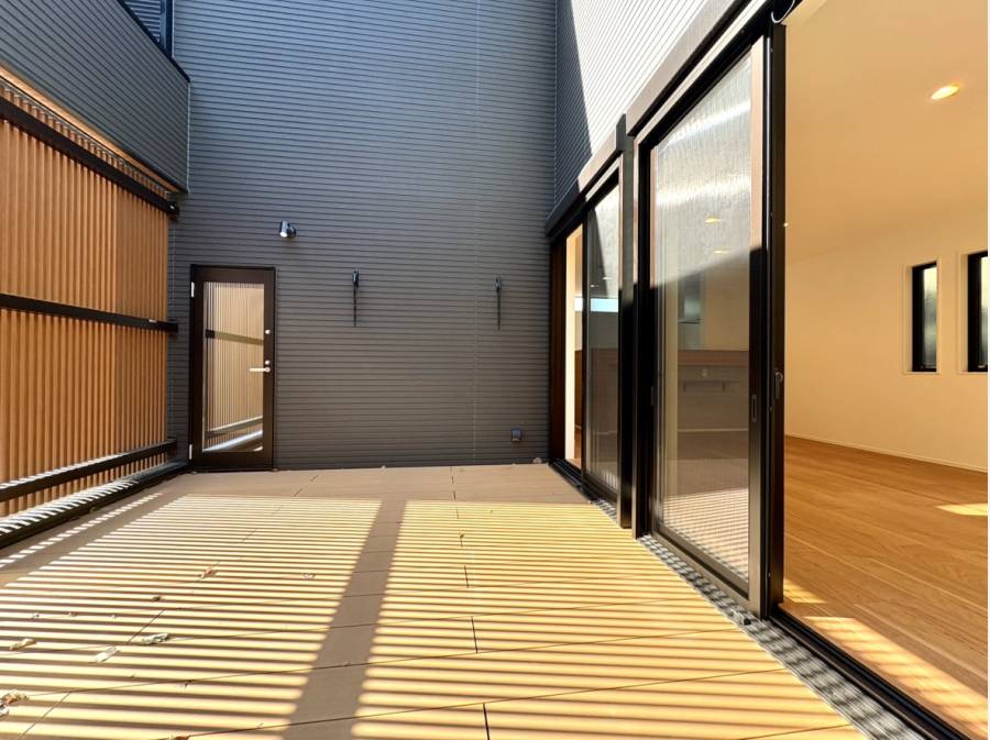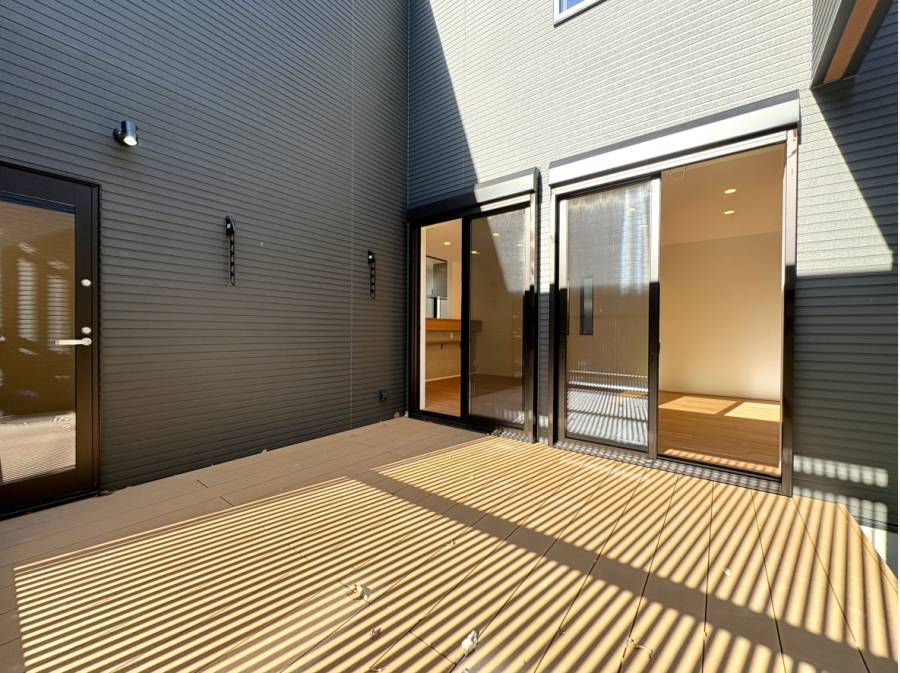 その先には、室内と屋外をゆるやかにつなぐ広いウッドデッキが広がり、空間にさらなる開放感をもたらします。