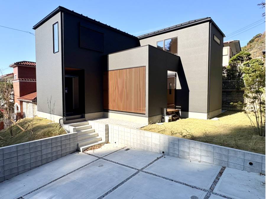 外観は、鎌倉の緑豊かな景観に調和するシックなブラックと木目調の格子が特徴的。