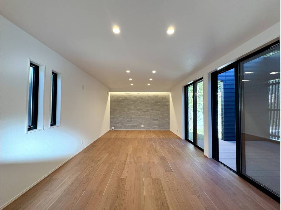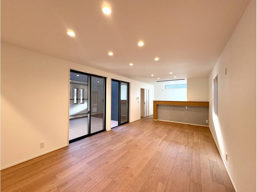 約20帖のLDKからは8帖の大型ウッドデッキが広がり、芝生のお庭と一体化した開放感ある暮らしを楽しめます。