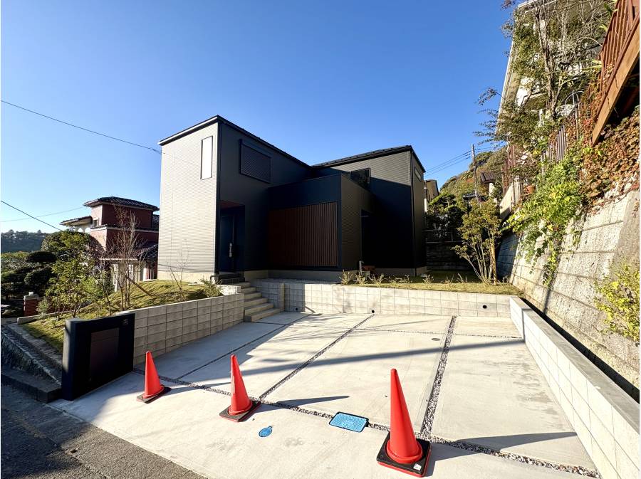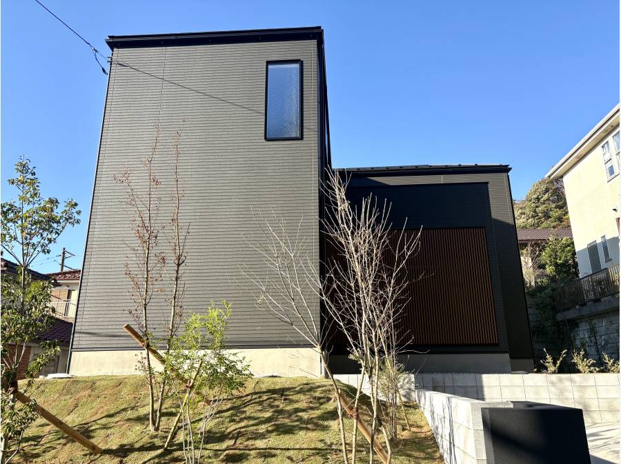 土地は260.47㎡(約78.79坪)の広さを持ち、芝生の庭や植栽を楽しむことができる空間を確保。また、カースペースは並列で2台分の駐車が可能なゆとりある敷地です。建物の外観は黒を基調に、木製ルーバーがアクセントとなったスタイリッシュなデザイン。周囲の緑豊かな景観と調和する佇まいです。