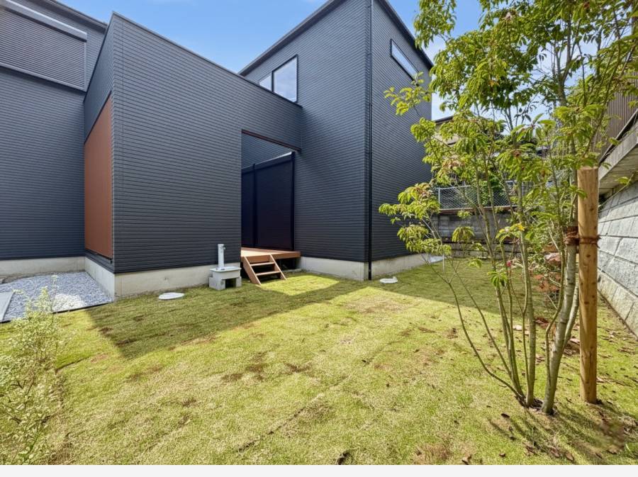 ブラックを基調としたシックな外観に、木目調の格子が調和し、洗練された印象を与えます。カースペースは2台分を確保し、緑豊かな庭も備えた心地よい住まいです。