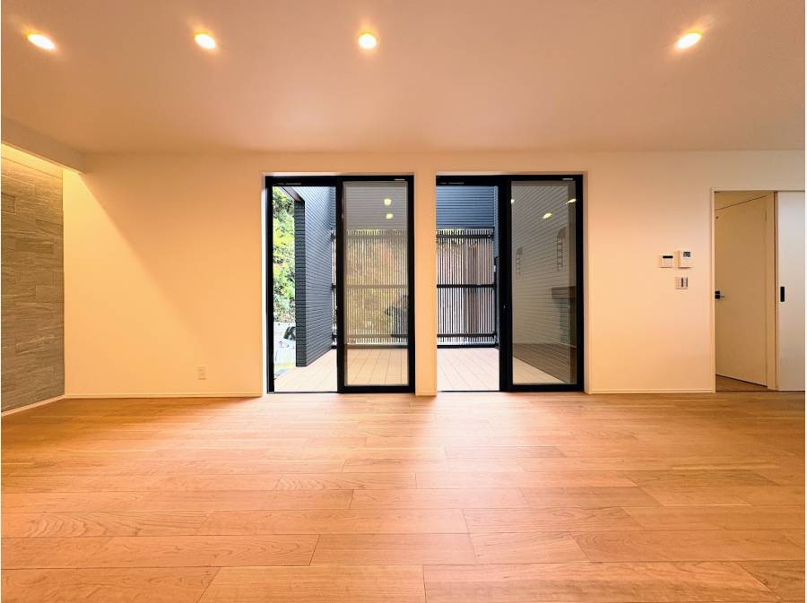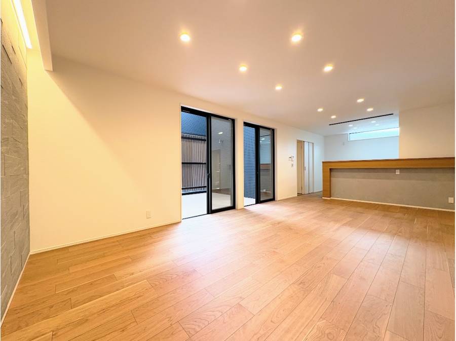 内装にも細部までこだわりが詰まっています。約20帖のリビングダイニングキッチンには、重厚感のある石壁を採用し、オープンキッチンとともに上品な雰囲気を醸し出しています。リビングから続くウッドデッキでは、緑を眺めながらくつろげる特別な時間をお楽しみいただけます。