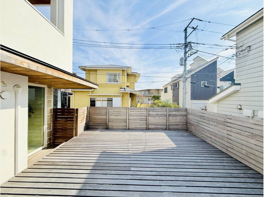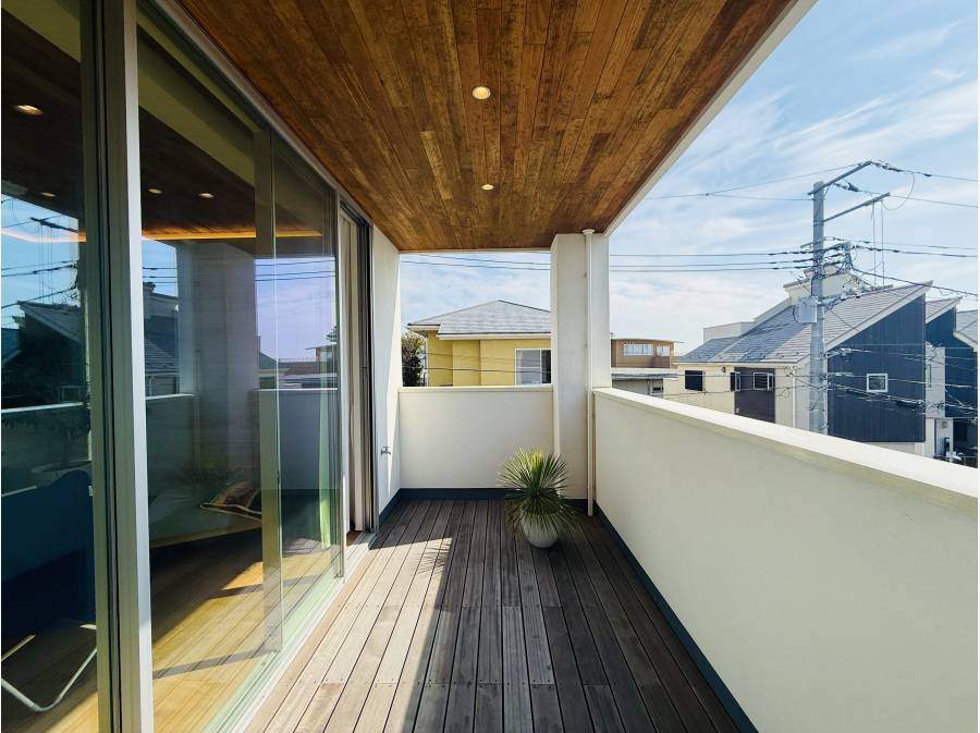 一番の自慢は、リビングからそのまま繋がる約21帖のスカイテラス。窓を開け放てば、心地よい潮風が通り抜ける「呼吸する空間」に早変わり。