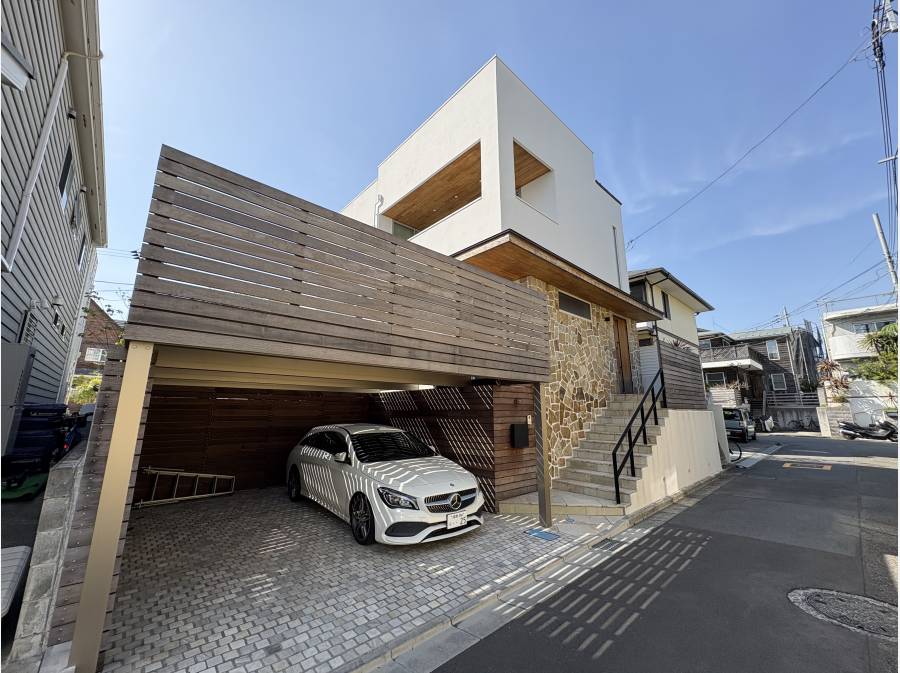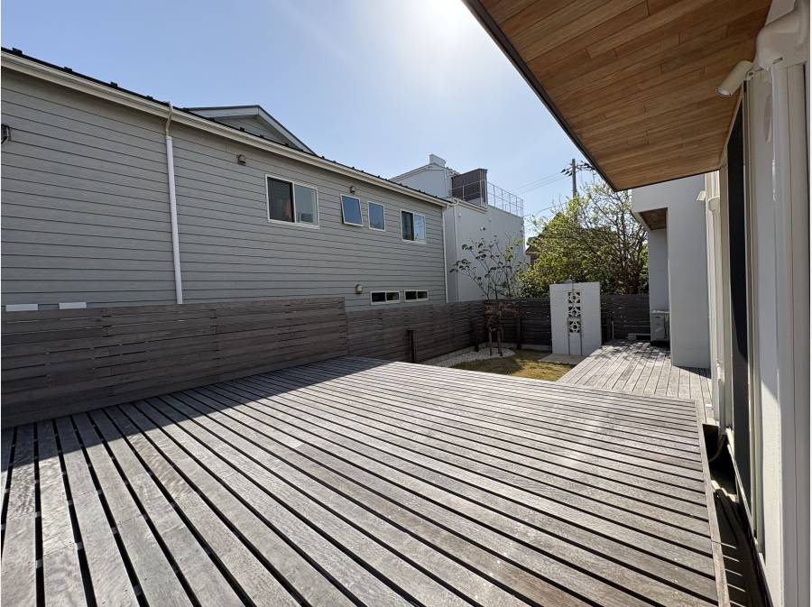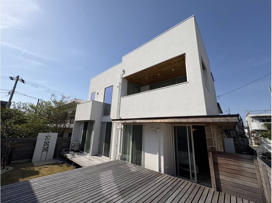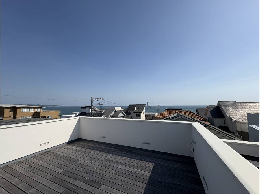 ルーフバルコニーから海を望む3LDKの邸宅です。敷地約16㎡、建物約120㎡。2台駐車可能なビルトインガレージの上にデッキ庭があり、敷地を有効に活用しています。