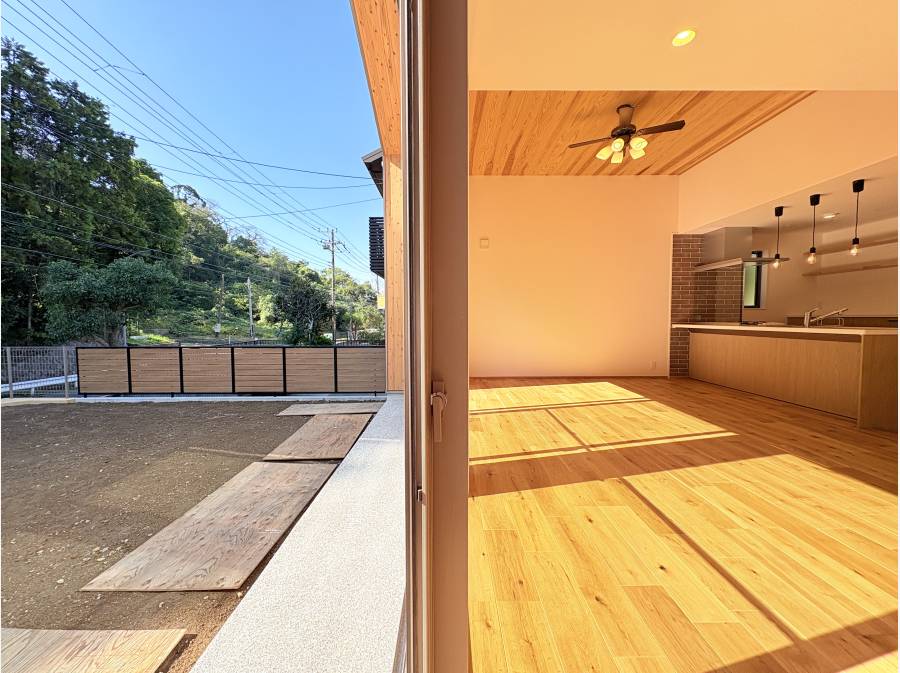 一階リビング+和室構成で、お庭とつながる開放的な空間設計。