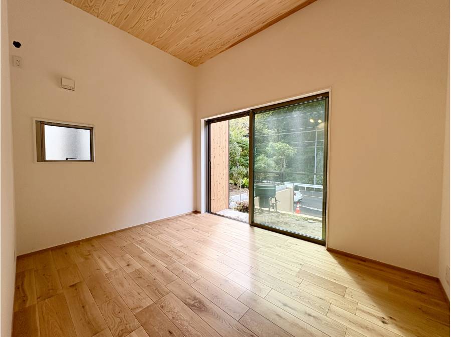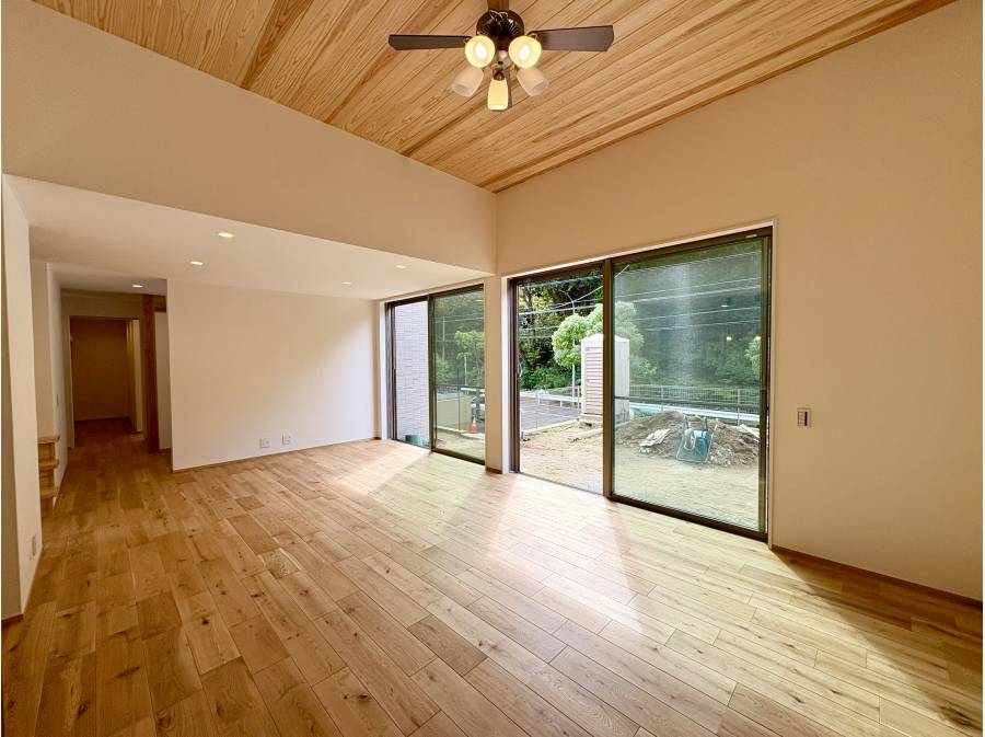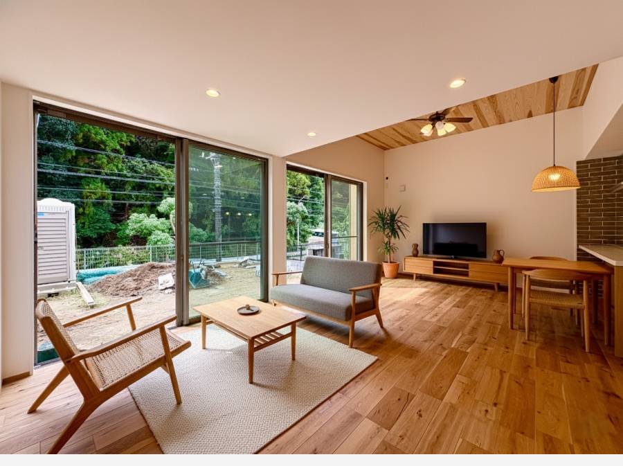 リビングの大きな窓からは、まるで森の中にいるような自然豊かな借景が広がり、日々の暮らしに癒しを与えてくれます。濡れ縁でお茶を楽しんだり、南向きの広い庭でガーデニングを楽しんだりと、穏やかで充実した日常をお過ごしいただけます。