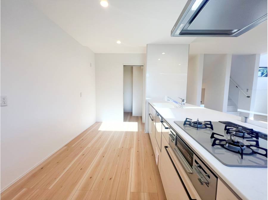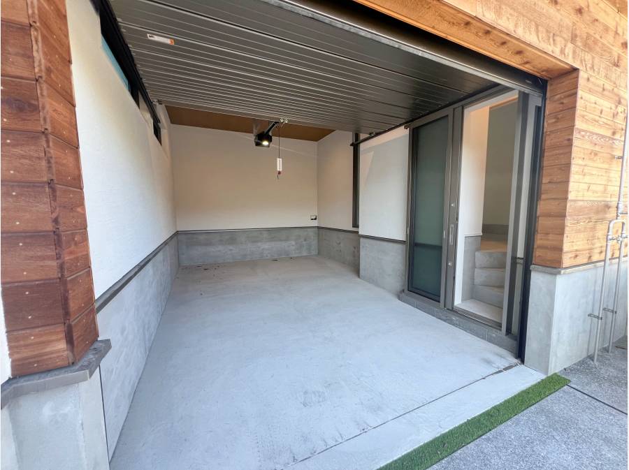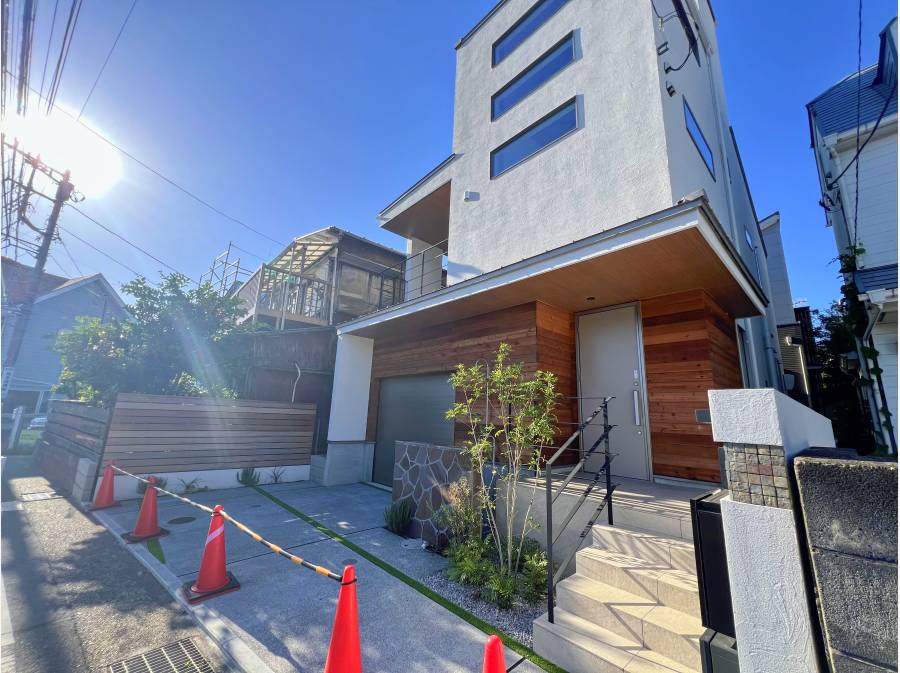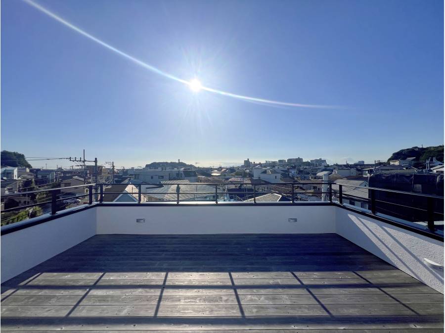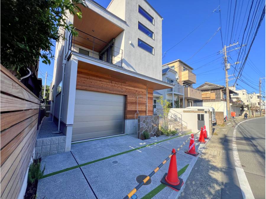 ガレージ付きの新築戸建て。雨の日も安心して室内へ。晴れた日には屋上から江の島を望み、家族や友人とBBQが楽しめます。