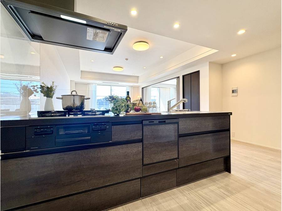 黒を基調とした重厚感のあるペニンシュラキッチンは、家族との会話が弾む場として活躍します。1620サイズの浴室では、1日の疲れを癒すリラックスタイムが楽しめます。