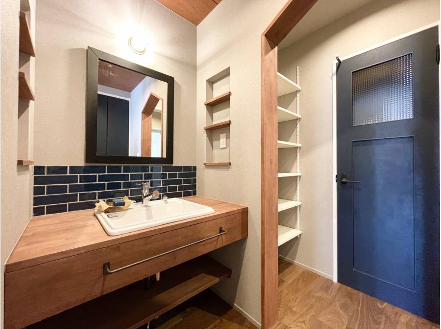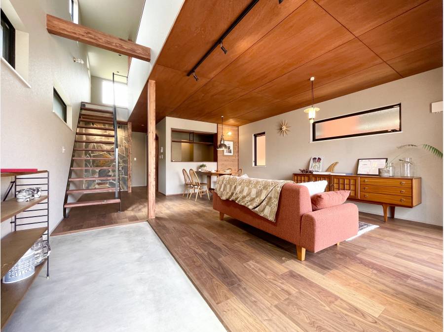 リビングに続くウッドデッキや石張りの壁、玄関の土間スペースが特徴で、アウトドアスタイルを楽しめる設計です。カースペースは並列で2台駐車が可能な広さがあり、日々の駐車も快適です。
