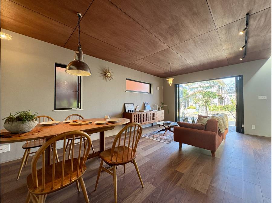 天井板張りや大開口のFIX窓から降り注ぐ陽光が、リビングに開放感と温かみをもたらします。