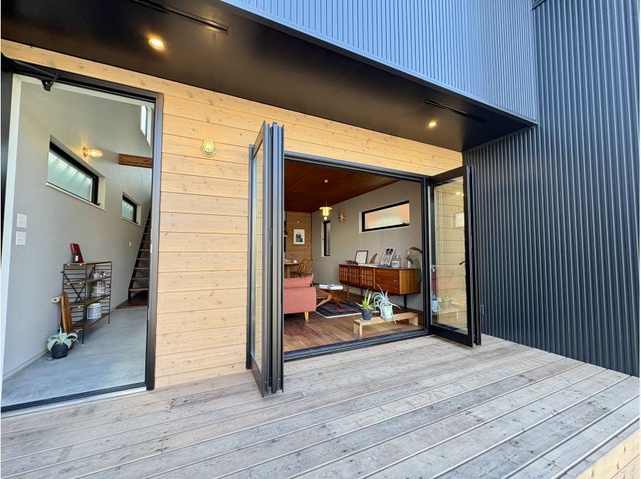 窓を開け放てば天然木のウッドデッキが広がり、セカンドリビングのように寛ぎを楽しめます。