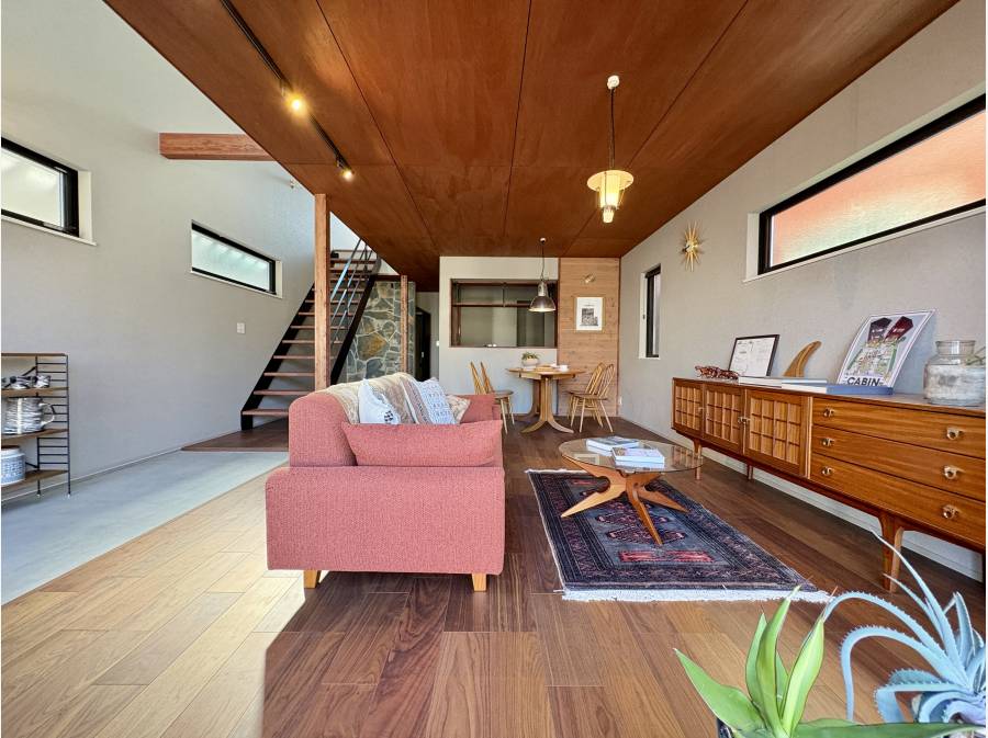 玄関から広がる土間リビングや鉄骨階段、吹き抜けの大空間が訪れる人を惹きつけます。天然木のウッドデッキや石張りの壁が生活に趣を加え、7帖のフリースペースはテレワークにも適しています。