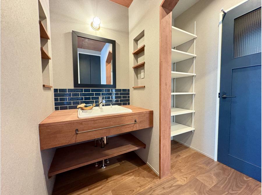 水まわりにも造作洗面台やアクセントタイルを配し、日常を快適に彩ります。