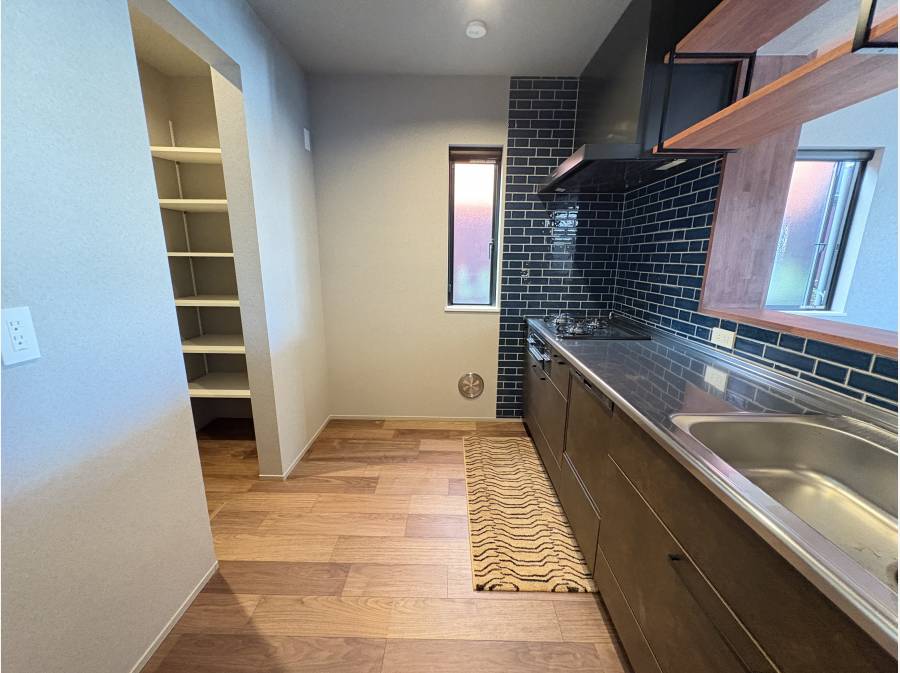 キッチンには背面パントリーを備え、食材や調理家電をすっきり収納できる動線設計。