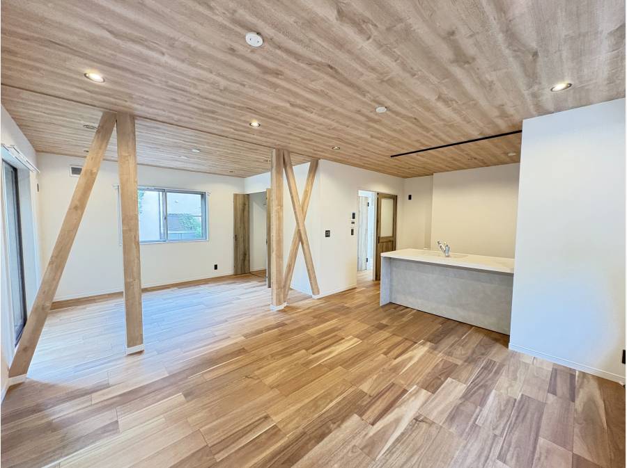 フルリノベーションされた室内は、梁を見せた約20帖の広々としたLDKが特徴的で開放感があります。