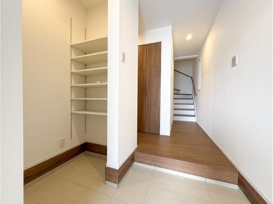玄関スペースのシューズインクロークは両脇に可動棚があり大容量で使い勝手がよさそう。