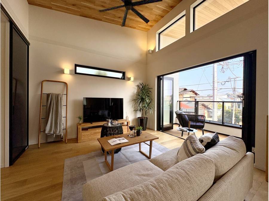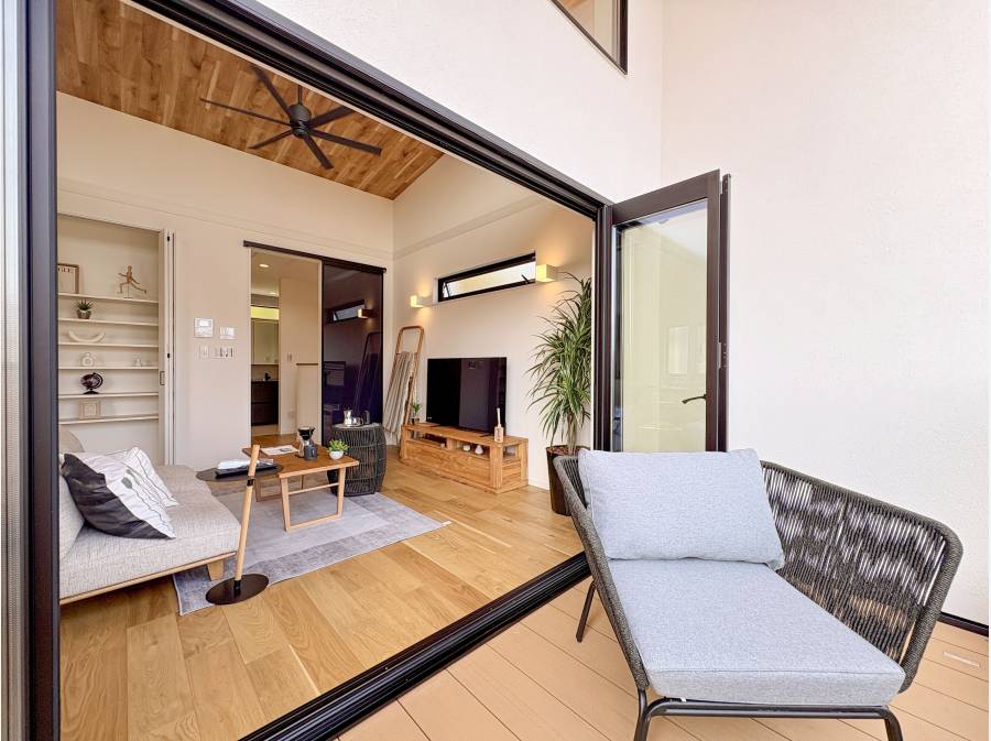 ダイナミックな吹抜となった空間、そのままシームレスにバルコニーへ。