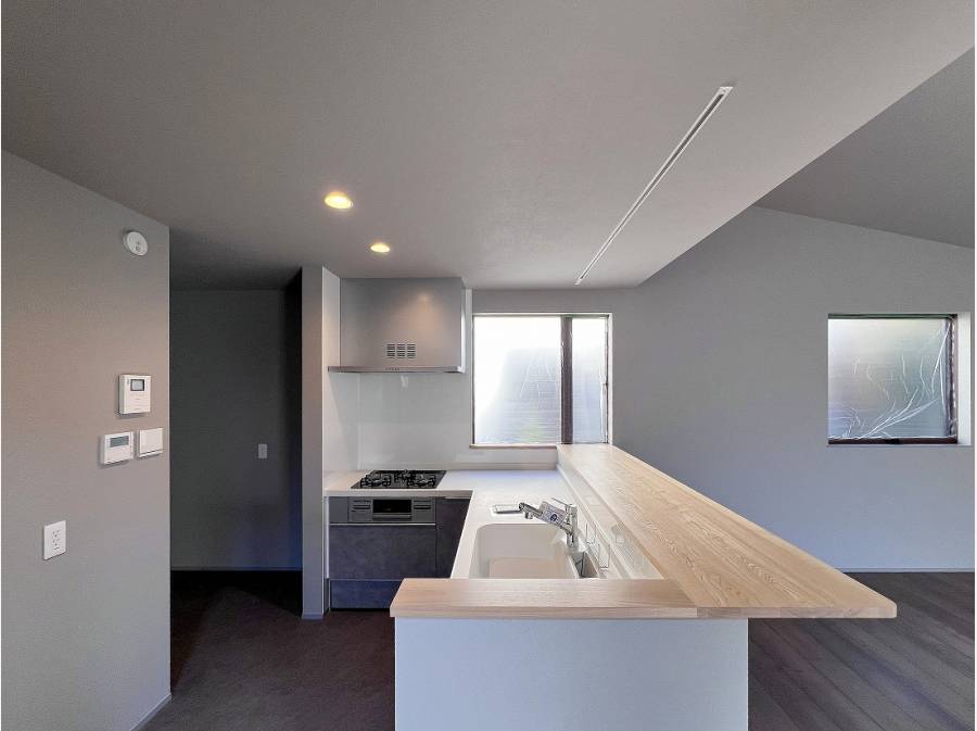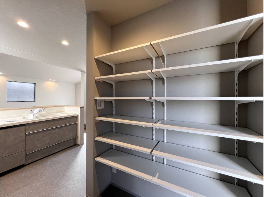 キッチンの背面にはパントリーとしても活用できそうなシームレスな空間があり、さらに玄関と繋がる回遊動線が確保された快適な間取りが魅力的です。