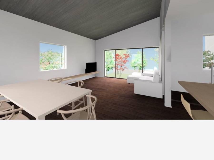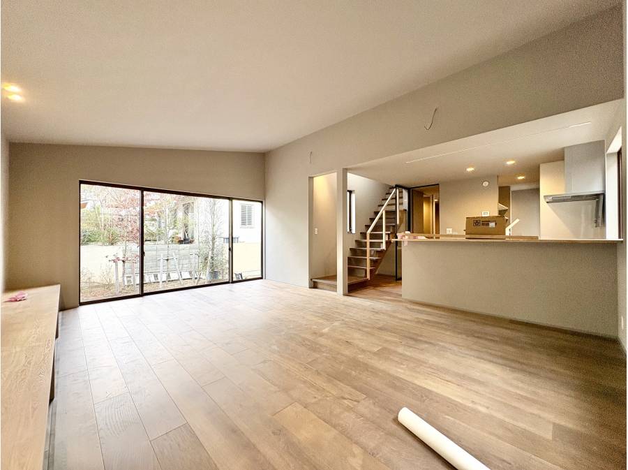 広さ24帖を超えるリビングは、窓の外に広がる庭の緑と一体感のある開放的な空間。