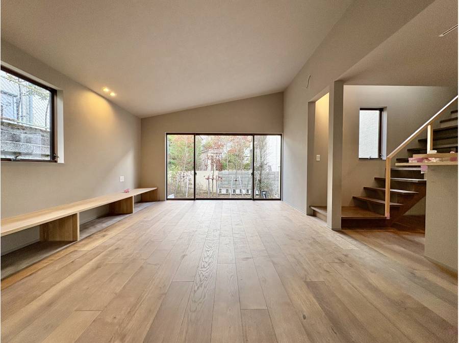 ≪ガレージハウス≫広々とした24帖超のリビングから庭の緑を楽しむ、鎌倉・笛田の新築邸宅。趣味とゆとりある暮らしを。