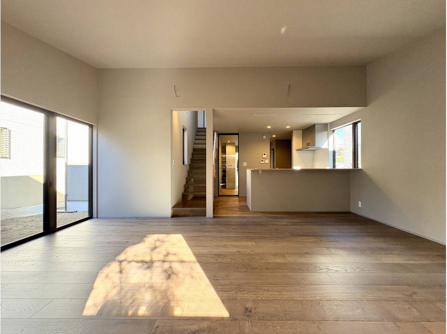 24帖を超える広々としたLDKは、勾配天井と大きな開口部が特徴です。光の入り方を丁寧に計算し、庭の緑を室内に取り込むような設計がされています。キッチンの背面にはパントリーとしても使えるスペースがあり、玄関へとつながる回遊動線が確保されているため、生活がスムーズに送れる工夫が随所に見られます。