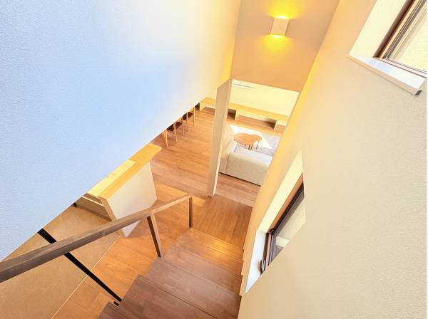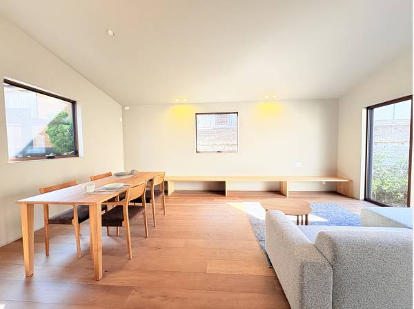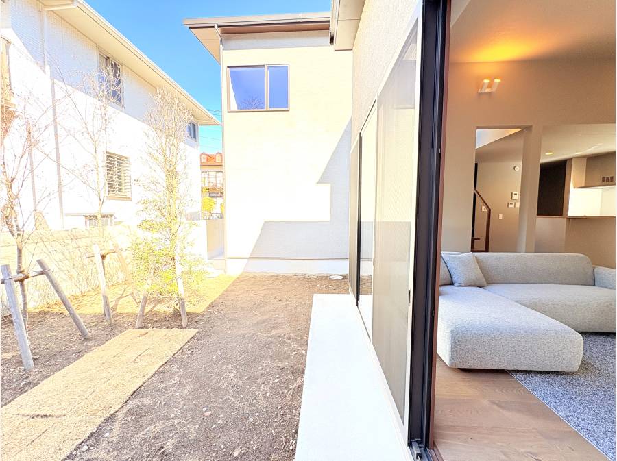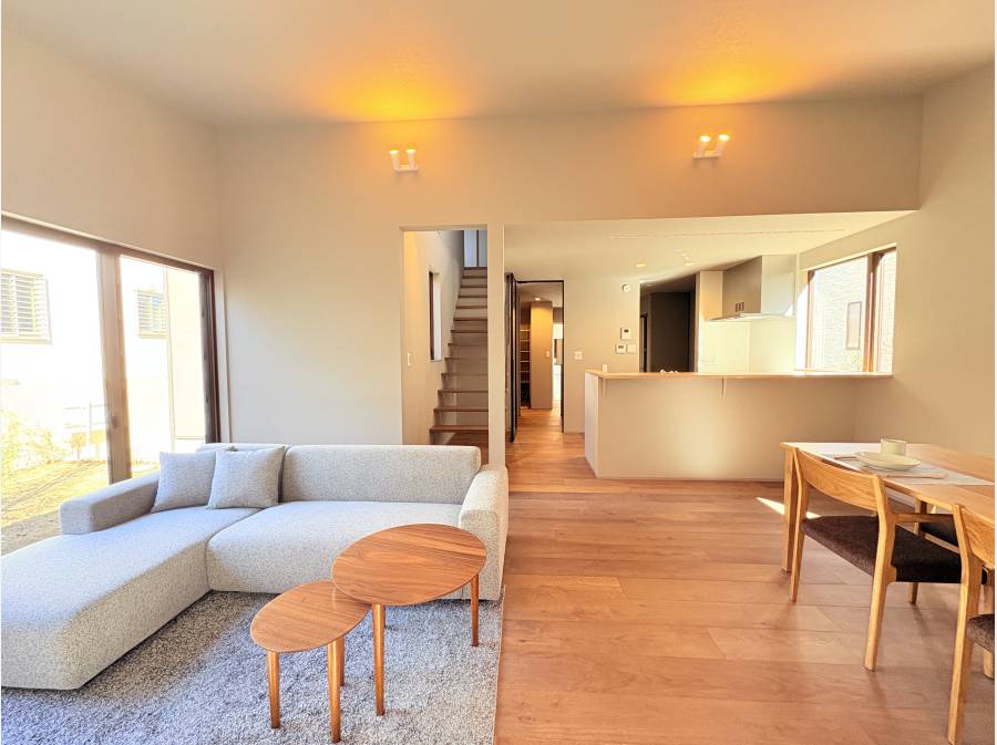 1階のLDKは約24.3帖のゆとりある空間を提供。吹抜から豊かな自然光が差し込み、リビングからフラットに繋がるお庭がさらなる広がりを感じさせます。