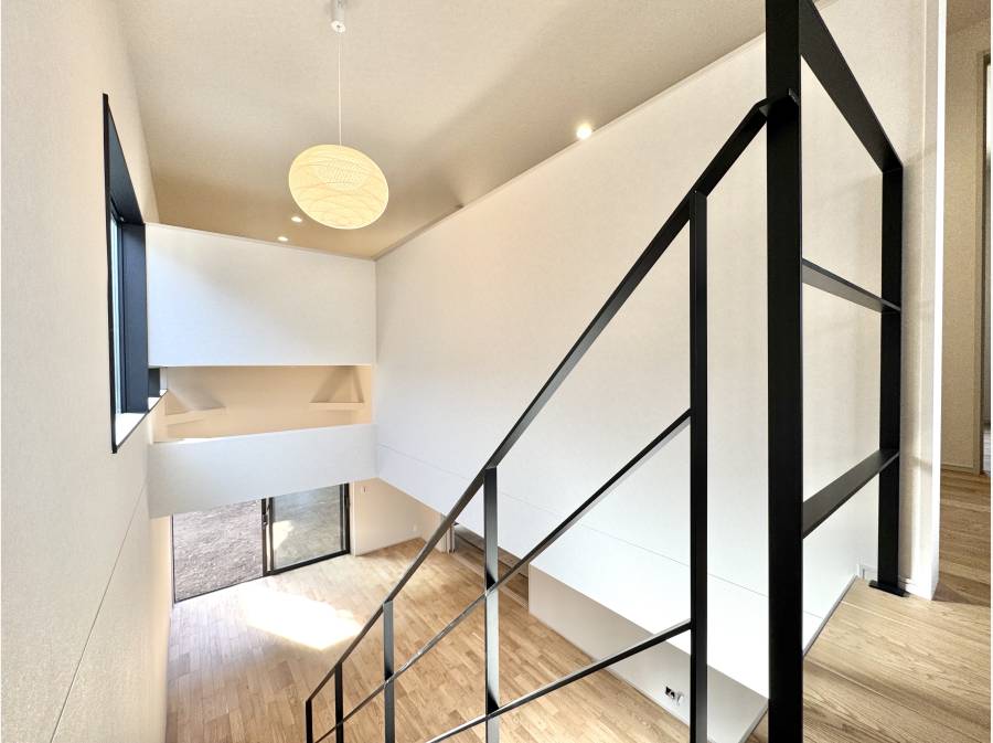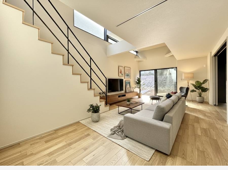 室内は吹抜けと高窓が効いた開放設計。やわらかな光がLDKに回り込み、朝も夕方も気持ちよく過ごせる空気をつくります。階段のラインや抜け感も美しく、どこを切り取っても絵になる住空間となっております。