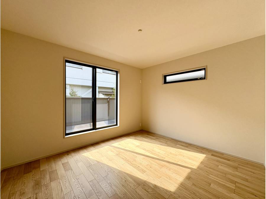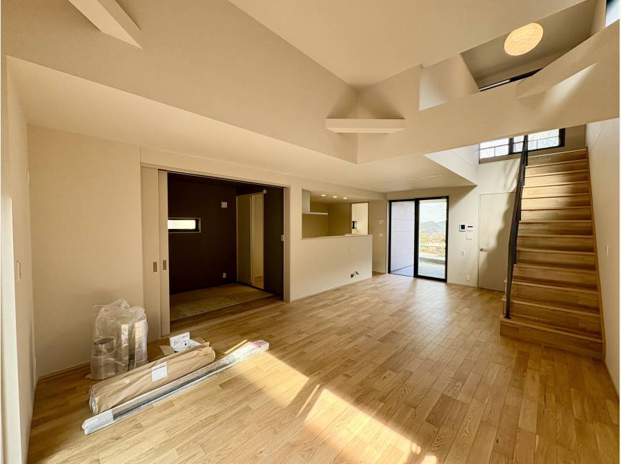 室内に入ると、21.4帖の広々としたLDKが広がり、高窓から差し込む柔らかな陽射しと吹き抜けが、明るく開放的な空間を演出しています。