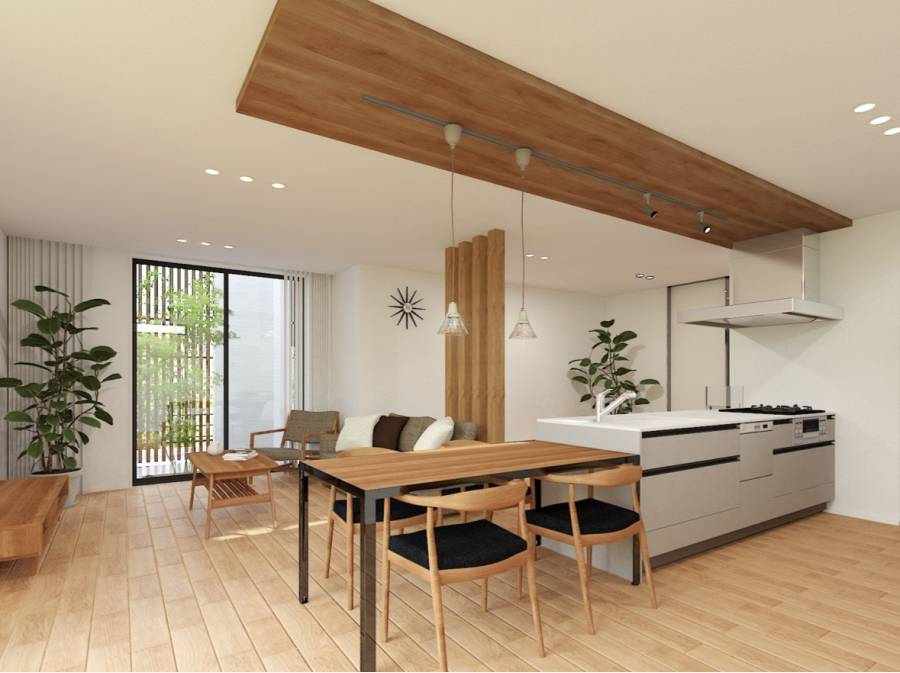 約18帖の広々としたLDKは、勾配天井と大きなサッシが開放感を演出。まるでリゾートのような雰囲気を醸し出す空間で、システムキッチンの設計により家族や友人とのひとときを快適に過ごせます。