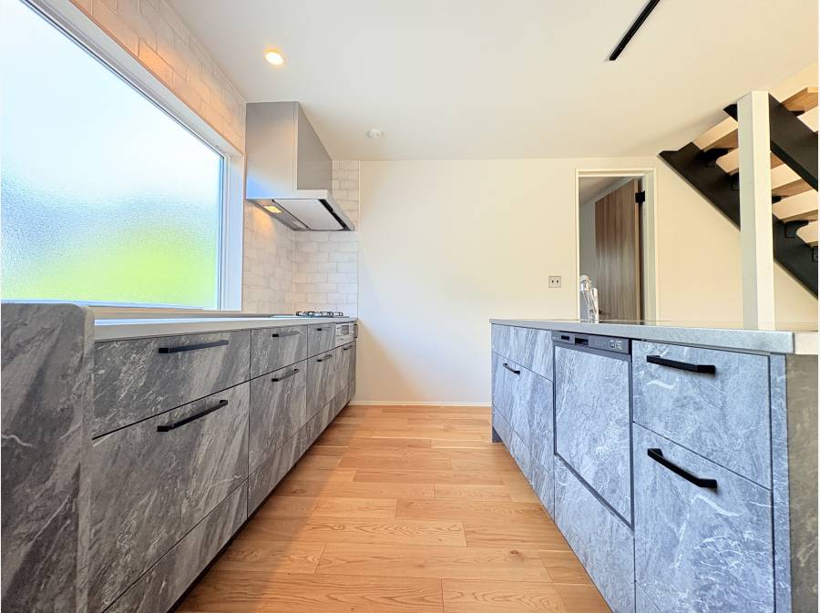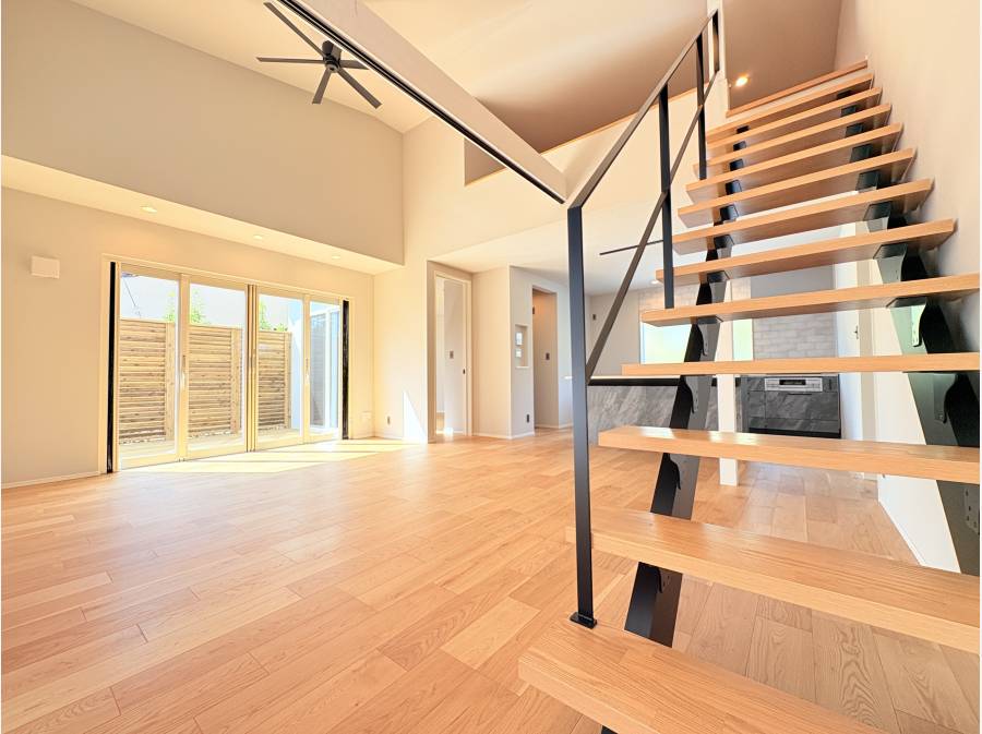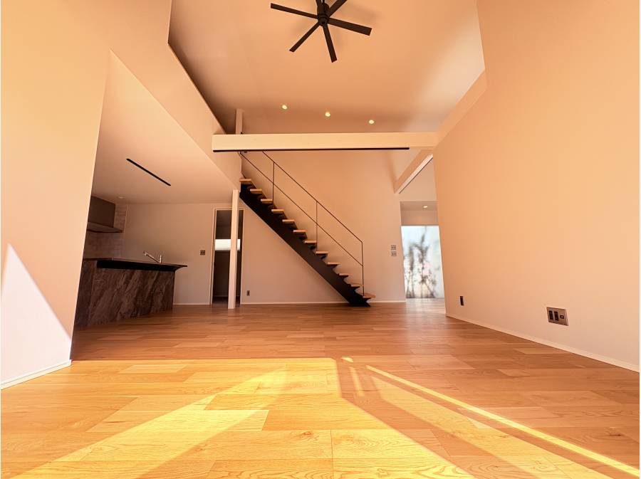 20.3帖の広々としたLDKは吹き抜け構造で、開放感のある設計が魅力です。ご家族でくつろぐのにぴったりな、居心地の良い空間となっています。