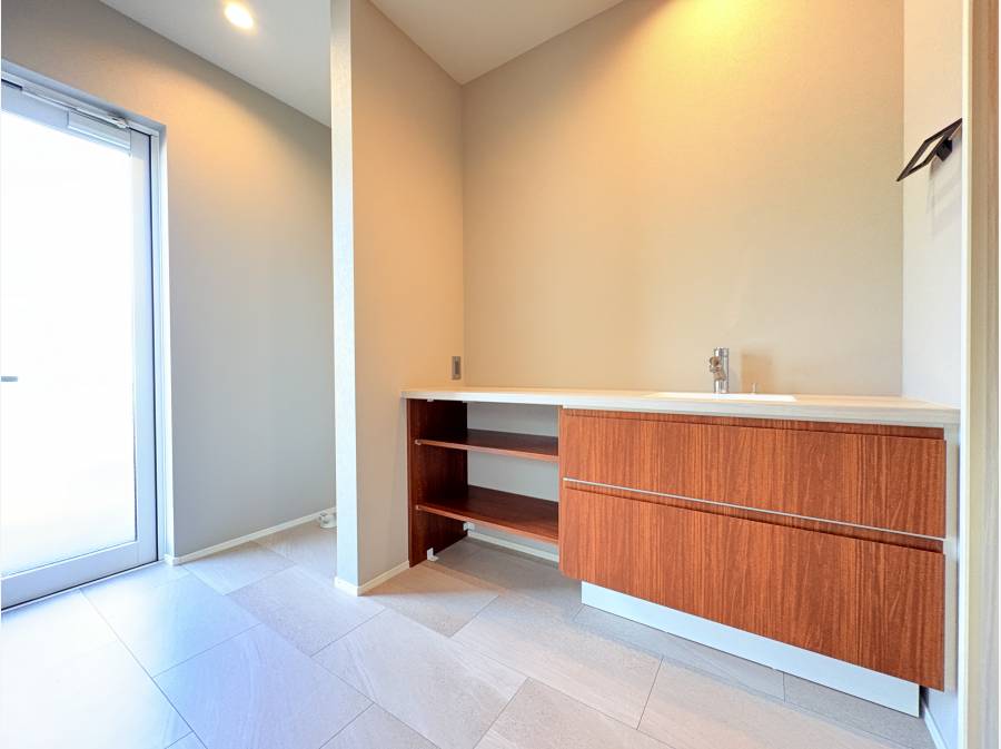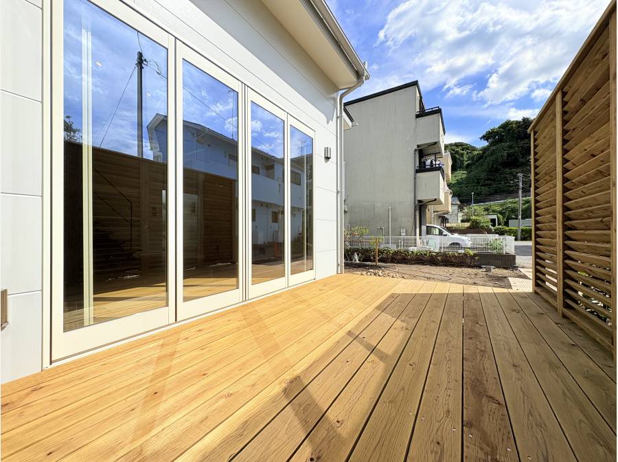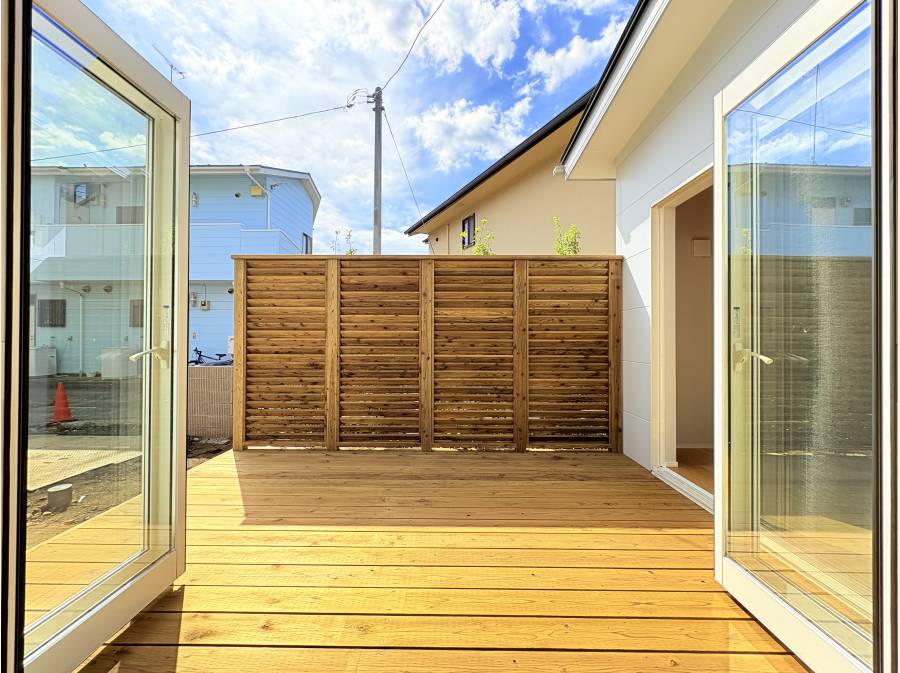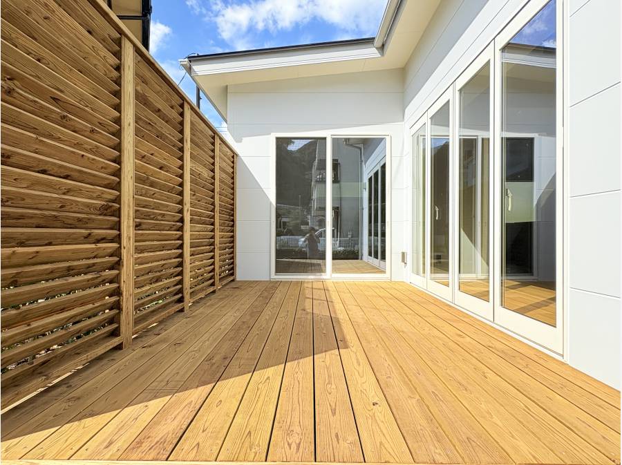 リビングとつながるウッドデッキでは、外の空気を感じながらリラックスした時間を過ごせます。お食事や趣味のひとときに最適なスペースです。
