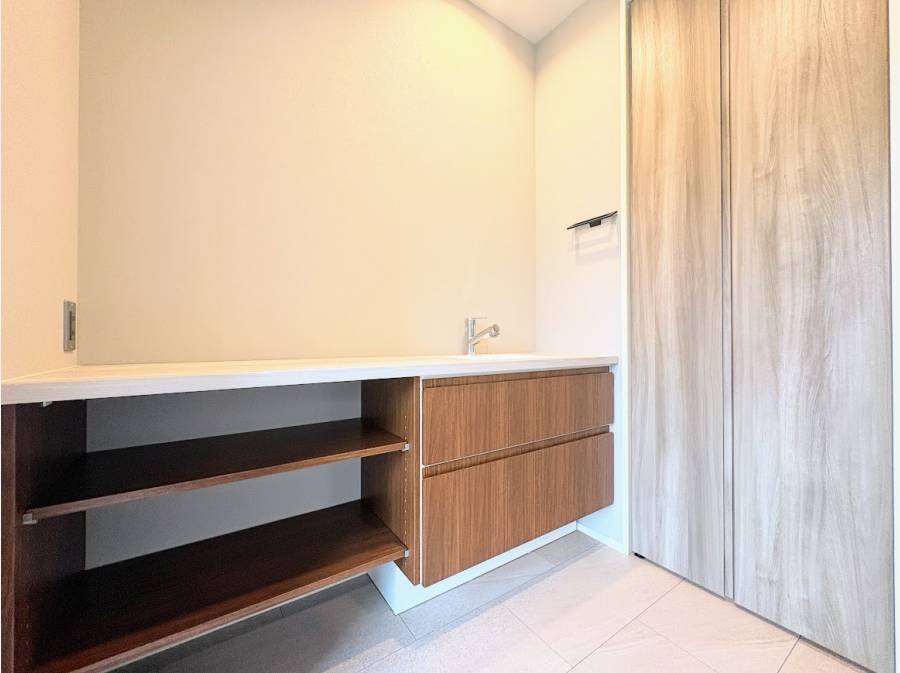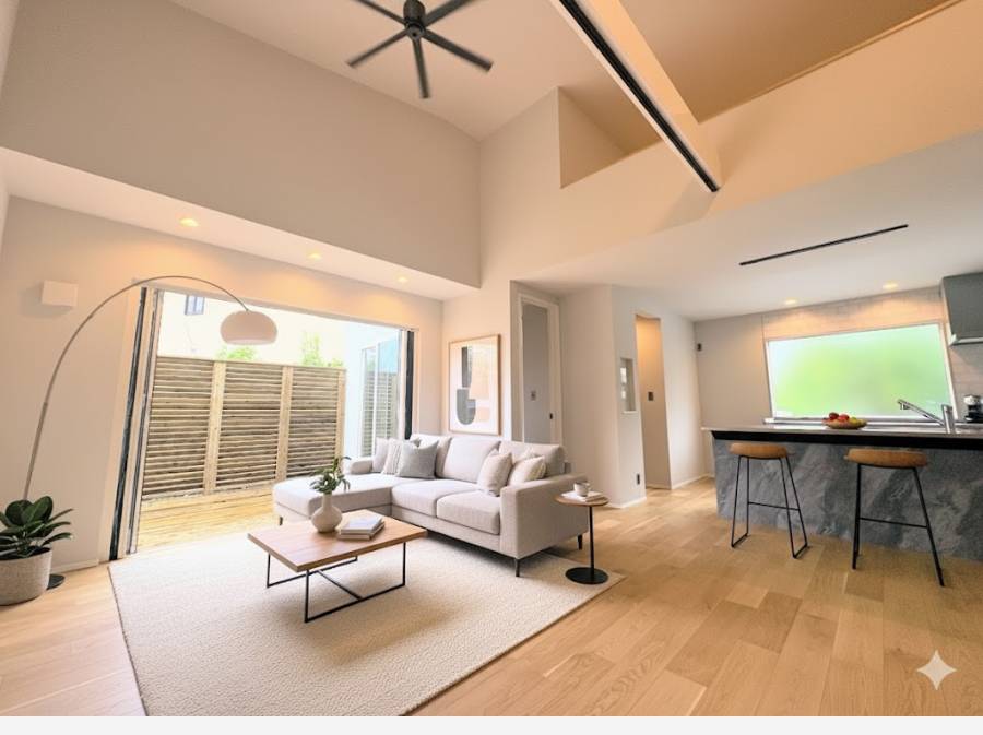 ワンフロアで生活が完結する平屋の魅力は、効率的な動線と快適さ。20帖を超える広々としたLDKは、家族が自然と集まりたくなる開放感ある空間です。そこから続くウッドテラスでは、休日にブランチを楽しんだり、ゆっくりと過ごす時間を楽しむことができます。