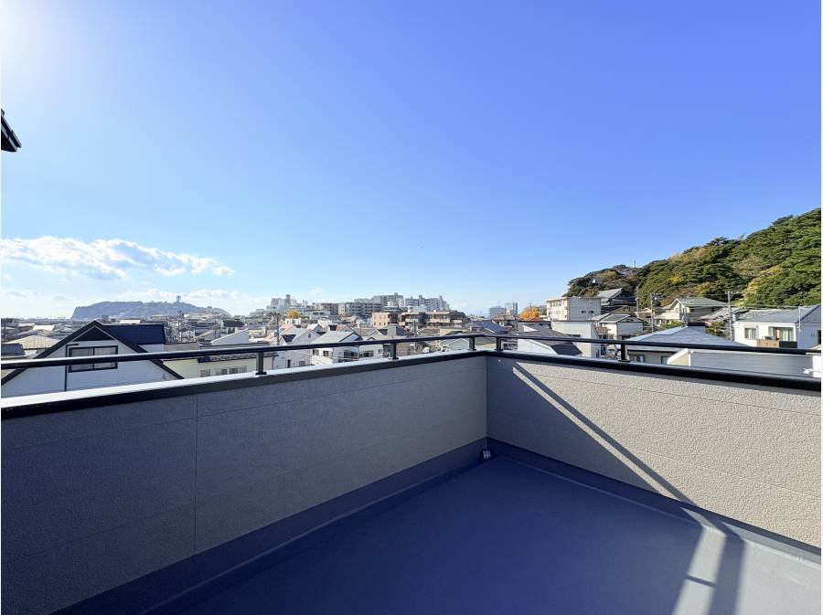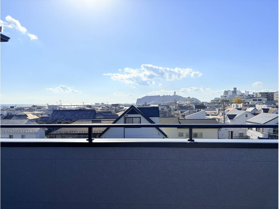 江ノ島にほど近い新築デザイナーズハウスは、海と街を一望できる眺望が魅力です。特にルーフバルコニーからは、海や江ノ島、さらには富士山までを楽しめる贅沢なパノラマが広がります。